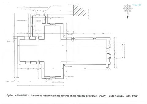 Le village de Thoigné est situé à une dizaine de kilomètres au sud-ouest de Mamers, dans la partie nord du département. L’église aurait été construite aux XIe et XIIe s. à l’emplacement d’une villa romaine. Le volume de l’édifice actuel date de la fin du Moyen Âge (XVe-XVIe s.). Elle fut agrandie en effet à la fin du XVe s. de deux chapelles formant transept et d’un chœur à chevet plat. Un court clocher de charpente, couvert en ardoises, est implanté à l’extrémité occidentale de la nef, précédée à l’extérieur par un petit porche. Un grand arc en plein cintre fermé dans le mur occidental témoigne peut-être d’un projet abandonné d’agrandissement à l’ouest.