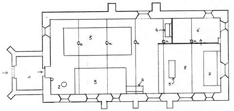 L’église est un édifice de plan rectangulaire, à chevet plat, situé dans son enclos paroissial. Elle est composée du chœur, de la nef et d’un seul bas-côté au nord, couverts d’une toiture unique en petites tuiles, ce qui donne à l’édifice un aspect dissymétrique. Elle est précédée d’un clocher-porche, surmonté d’une flèche, couverts d’ardoises.