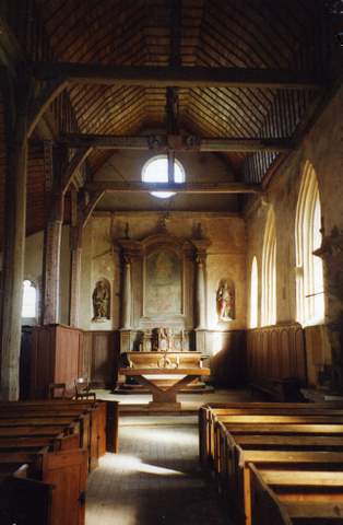 Le vaisseau principal est couvert d’une charpente lambrissée en merrains, soutenue par une structure de poteaux de bois, avec jambettes et aisseliers, sablières moulurées, le tout portant traces de polychromie. La poutre de gloire très ornée et des éléments de litres funéraires complètent le décor intérieur de l’église.
