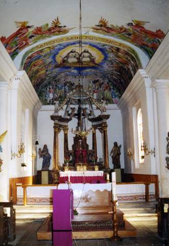Quelques toiles peintes anciennes, une chaire sculptée, quelques sculptures proviennent sans doute de l’édifice disparu.