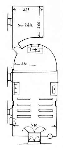 Il s’agit évidemment d’un humble édifice de haute montagne (longueur totale 16,55 m, largeur de la nef 5,30 m, longueur du chœur 3,60 m). Il se compose de deux travées couvertes d’une voûte en berceau surbaissé et séparées par un doubleau aplati reçu par des pilastres ; elles se terminent par une abside en hémicycle. Deux petites fenêtres en plein cintre éclairent la nef du côté sud. À la façade, une étroite fenêtre, un petit oculus et un clocher-arcade. Une sacristie a été accolée à l’abside ; elle est couverte de bardeaux de mélèze.