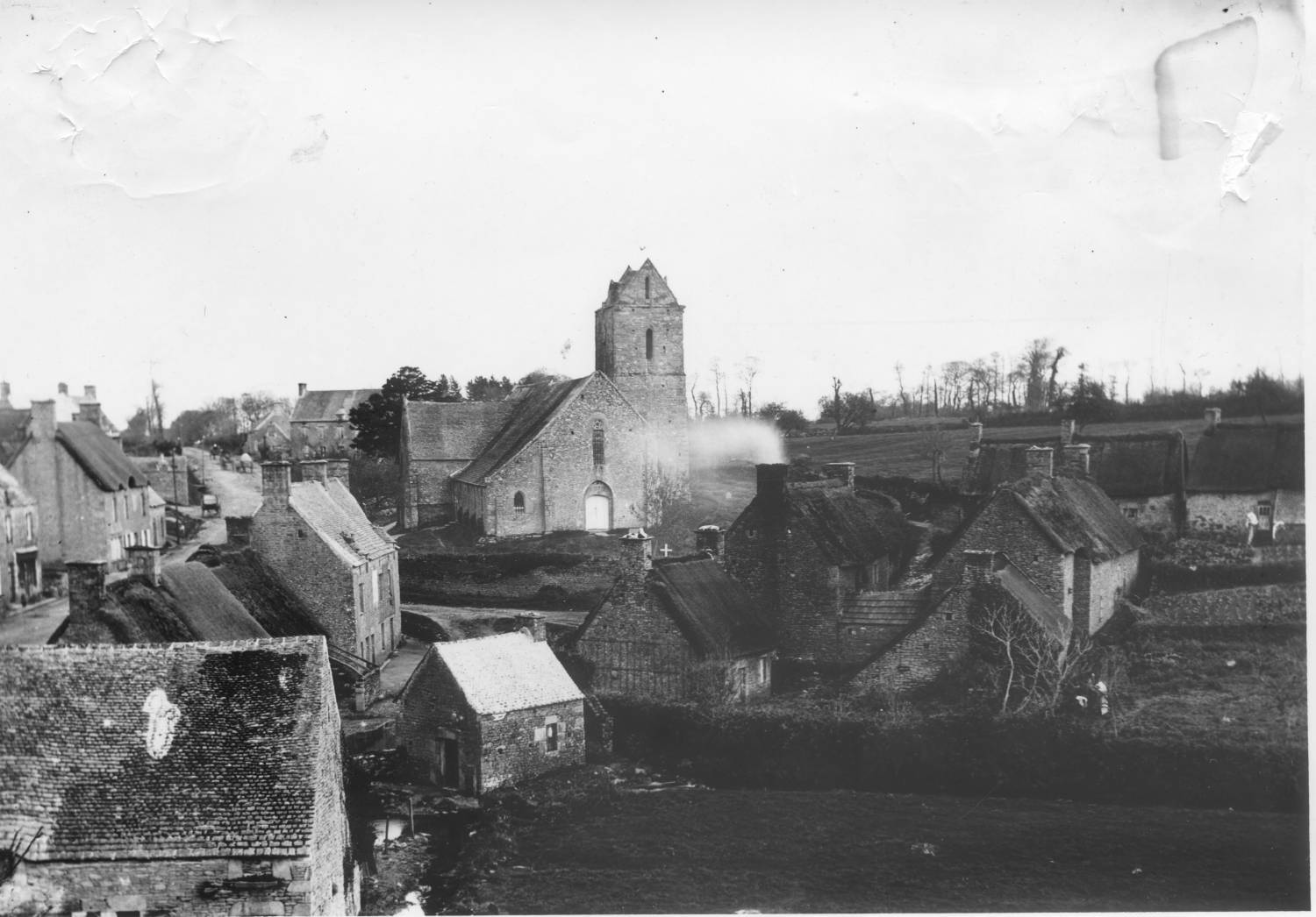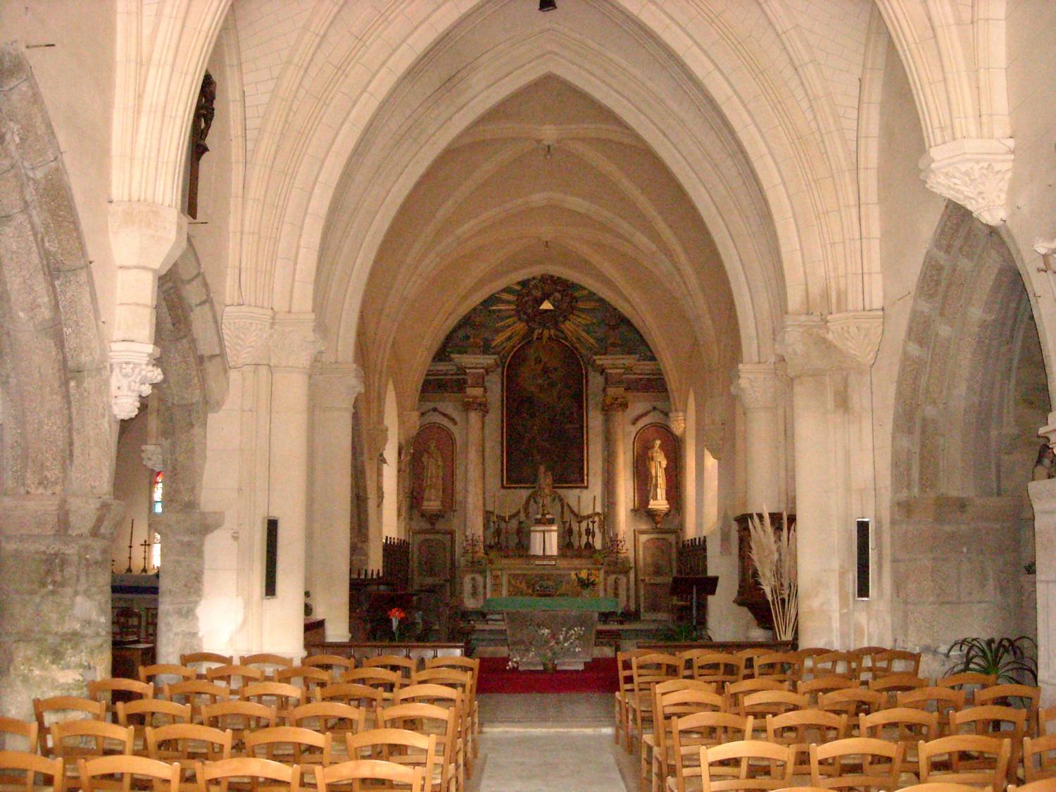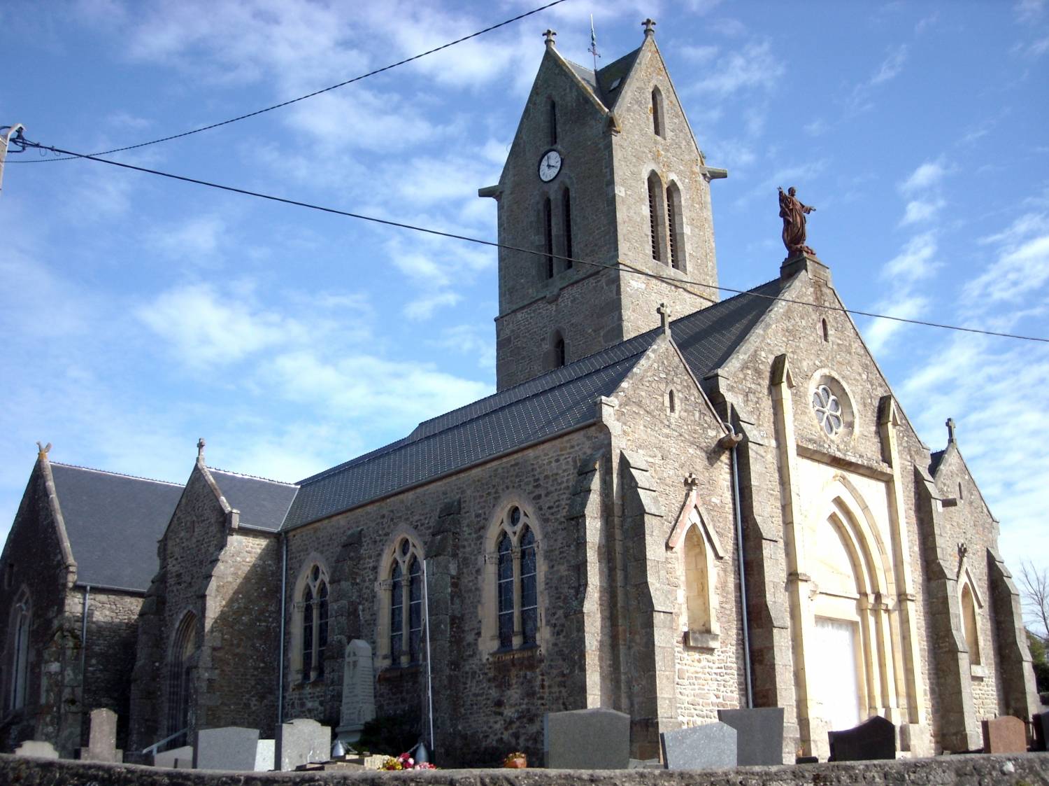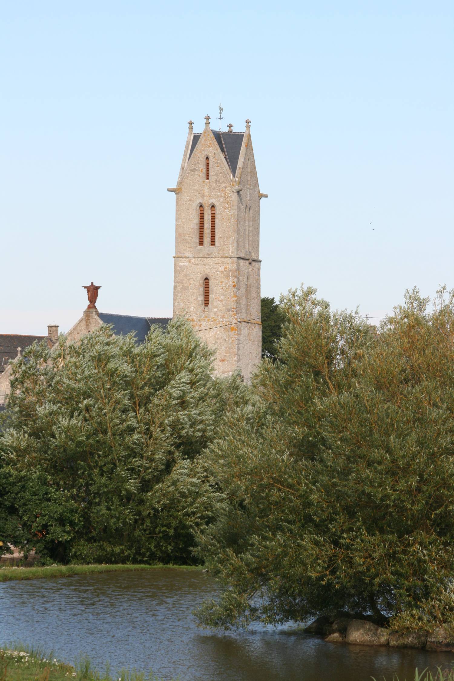 L’origine de cette église se situe dans la première moitié du XIIIe siècle, si l’on se réfère aux trois fenêtres à lancettes du chevet, de style ogival. Cet édifice a reçu beaucoup de modifications au cours des siècles. La nef est flanquée, au nord, d’un bas-côté dont les arcades sont soutenues par de larges piliers cylindriques en granit. A gauche du chœur, une grande arcade ouvre sur la chapelle du Rosaire, construite au XIVe siècle comme l’attestent les fenêtres et les nervures de la voûte. A droite de la nef, sous le clocher, est aménagée la chapelle du Sacré-Cœur, avec un superbe autel en pierre calcaire. Le chœur et le sanctuaire ont dû être refaits à neuf après la Révolution. Fin XIXe siècle, l’église a fait l’objet de grands travaux. Le portail ouest du XIIIe siècle a été transféré au nord et remplacé par un portail en pierre calcaire. Le pignon porte à son sommet une statue du Sacré-Cœur. Pour faire pendant au bas-côté nord, un bas-côté fut construit au sud dans le même style. Ainsi la nef est bien éclairée, par des fenêtres semblables avec des vitraux représentant les douze apôtres. Le clocher, à l’origine un clocher à bâtière, fut exhaussé et deux fenêtres à lancettes accolées ont été ouvertes sur chaque face.