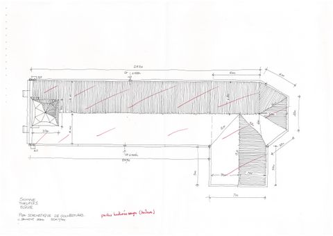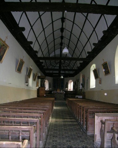 La charpente de l’église a été reconstruite au XVIe s. ; elle est caractérisée par une succession d’entraits apparents, rythmés par des blochets saillants sculptés. Un quadrillage d’arbalétriers cintrés et de pannes porte une voûte en bois en forme de berceau brisé. L’édifice comporte une longue nef rectangulaire prolongée par un chevet à trois pans.
