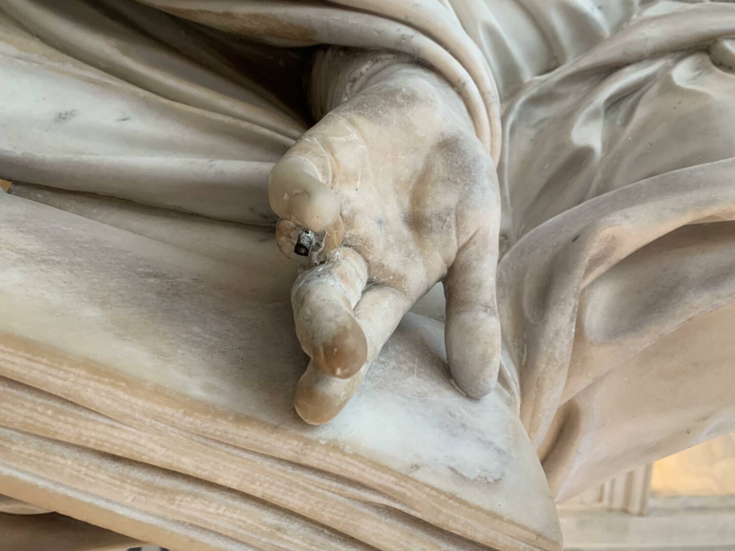 La restauration du tombeau du cardinal permettra de retrouver la lisibilité et la finesse des contrastes et des jeux de matière. L’annulaire du cardinal sera également restitué.
