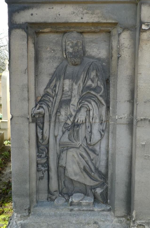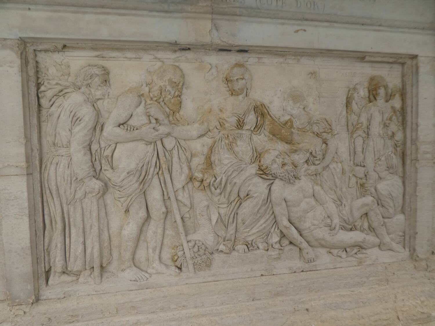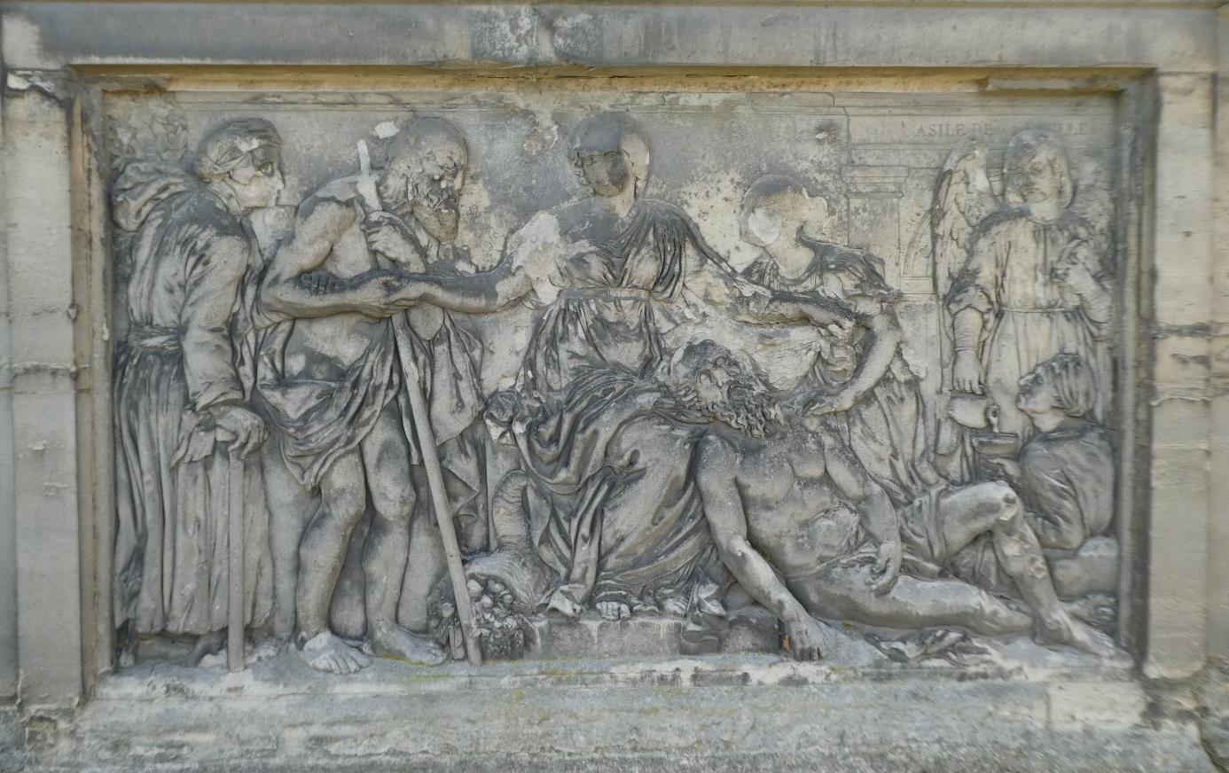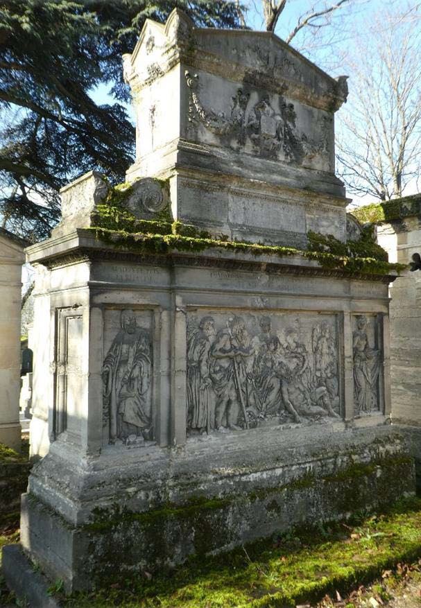 Hippolyte Louis René Charles Le BASCLE, marquis d’Argenteuil, né le 25 novembre 1780 à Paris et décédé le 13 mars 1838 dans cette même ville, est un aristocrate et philanthrope français. Il est le fondateur d’institutions pieuses et charitables à Paris et Thoires (Côte d’Or). Décédé sans descendance, le marquis d’Argenteuil est inhumé au cimetière de l’Est dit du Père-Lachaise. Un tombeau est alors érigé par souscription. Adolphe tavernier, architecte de la Compagnie générale des sépultures est chargé de la composition du monument. Celui-ci dessine un tombeau d’échelle monumentale qui se compose d’un large coffre reposant sur un soubassement, et surmonté d’un petit sarcophage flanqué de deux épaisses volutes sculptées. Si ce dernier présente un décor épuré, représentant les armoiries du défunt ainsi que des ornements funéraires classiques, le coffre est quant à lui orné de trois magnifiques bas reliefs dont l’iconographie fait référence aux actions philanthropiques du défunt marquis. Ces bas-reliefs sont confiés au ciseau d’Achille Joseph Etienne Valois, sculpteur réputé pour ses bustes et autres portraits.