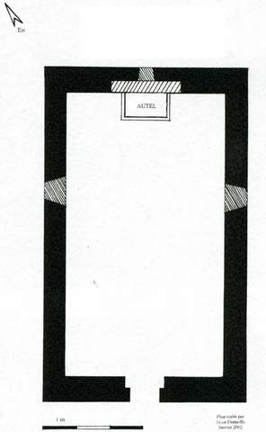 L’accès à l’intérieur se fait à l’ouest par une porte en plein cintre dont l’huisserie porte la date de 1823. Les flancs nord et sud sont percés, aux deux tiers de leur longueur, d’une baie en plein cintre. Une autre baie, de même tracé, ajoure le pignon oriental. Ces trois fenêtres permettent d’éclairer l’autel de la chapelle, conservé dans ses dispositions d’origine : adossé au mur de chevet, mis en valeur par la dépression que crée, au centre, une niche en arc brisé qui coiffe la seule baie du mur, l’autel conserve sa dalle chanfreinée au-dessus d’un coffre maçonné, haut de trois assises.