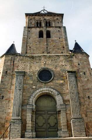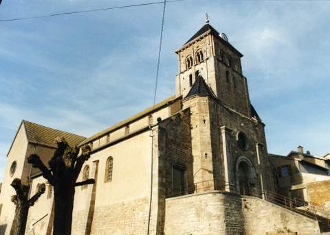 Le bourg de Tramayes est très ancien puisque d’après la préface du Cartulaire de Saint-Vincent de Mâcon, il existait un château au lieu-dit la Rolle au IVe siècle. L’agglomération, véritable lieu de passage stratégique, est située à proximité immédiate d’un col dominant la vallée de Gremolles au sud et au nord la vallée de Saint-Point. Le val de Saint-Point se prolonge par la vallée de la Grosne où se situe Cluny. En l’an 958 l’église de Tramayes était dédiée à saint Germain ; elle est maintenant placée sous la protection de Saint-Jean-Baptiste . Ses parties les plus anciennes remontent au début du XIIe siècle. L’édifice roman, parfaitement orienté, était composé d’une nef vraisemblablement unique, d’une travée droite de chœur sommée d’un puissant clocher et d’une abside semi-circulaire tournée vers l’est. En 1845, pour des raisons principalement liées à l’accroissement de la population et au développement économique cantonal, l’édifice fut agrandi et inversé. L’abside une fois démolie, un portail surmonté d’ un oculus fut aménagé dans l’arc triomphal. La nouvelle façade, dont le clocher roman constitue l’élément majeur, a été épaulée par deux tourelles d’escalier. À l’arrière de celle-ci; vers l’ouest, trois nefs d’inégale hauteur, un transept et une grande abside composent les volumes du nouvel édifice. Si son extérieur, en accompagnement du clocher, témoigne d’une monumentalité honorable, il n’en est pas de même pour son architecture intérieure néo-romane aux volumes mal proportionnés d’une facture très sèche et aux détails indigents. Tout l’intérêt de l’édifice réside dans le clocher de plan barlong, à deux étages. Le grès feldspathique (arkose) qui a fourni le matériau, arbore plusieurs teintes allant de l’ocre claire à l’ocre rouge et égaye la silhouette sévère et puissante. Un premier étage assez élancé, cantonné de pilastres d’angle et d’un pilastre médian plus étroit par face, est très peu percé. Seules deux baies en plein cintre s’ouvrent sur chaque face, de part et d’autre du pilastre médian. Une corniche portée par des modillons, non saillante au-dessus des pilastres, souligne la naissance du second étage, celui des cloches. L’arrêt brutal des pilastres d’angle et la construction en retrait du second étage, dont les angles sont cantonnés de colonnettes engagées, donnent à penser que le programme initialement prévu et son parti général furent modifiés en cours de réalisation. La composition de l’étage des cloches est fort différente : les faces planes sont animées par une succession de colonnettes engagées. Elles sont toutes de même diamètre et encadrent les baies des grandes faces, alors que sur les petits côtés elles ne font que les séparer. Les baies géminées, deux par face, sont toutes de même dimension. Elles s’ouvrent sous une archivolte non saillante et leurs retombées centrales sont portées par une seule colonnette au tailloir très développé. Les dimensions sont faibles par rapport aux surfaces de maçonnerie qui les entourent, concourant à l’expression massive du clocher. Cet étage est terminé par une corniche bien saillante qui repose sur les chapiteaux des colonnettes et sur des modillons sculptés. Des masques humains et animaliers décorent la plupart des chapiteaux et des modillons, mais certains motifs floraux, accompagnant quelques croix, en complètent l’iconographie. Un toit pyramidal, couvert de tuile vernissée, couronne le clocher. Si l’on en croit le profil en plein cintre de l’arc sous-tendant la travée du clocher et le style des deux chapiteaux sculptés d’animaux et de feuillages, l’influence brionnaise d’Anzy-le-Duc a vraisemblablement présidé à son édification, ainsi qu’à celle du second étage du clocher aux baies géminées sous archivolte. Seul le premier étage du clocher semble avoir eu comme modèle les compositions clunisiennes, bien illustrées par le clocher de l’église de Trambly. Il est courant de voir se juxtaposer en Bourgogne du sud, dans un même édifice, les deux influences dont les caractéristiques sont aisément identifiables. Les travaux de restauration du clocher ont permis de restituer toutes les dispositions qui avaient été altérées par le temps et les hommes. Entre autres, l’une des deux baies de la face ouest a pu être rétablie ainsi que les tambours manquants des colonnettes. La Sauvegarde de l’Art français a accordé une aide de 170 000 F pour la réfection du clocher et de sa toiture en 1998.
