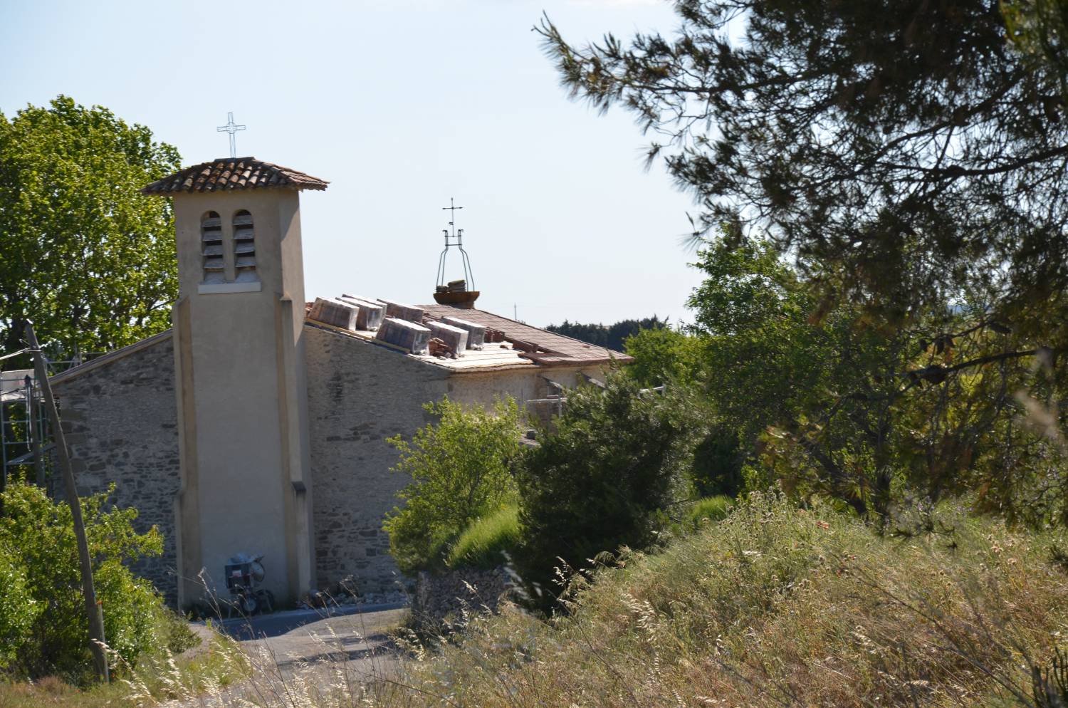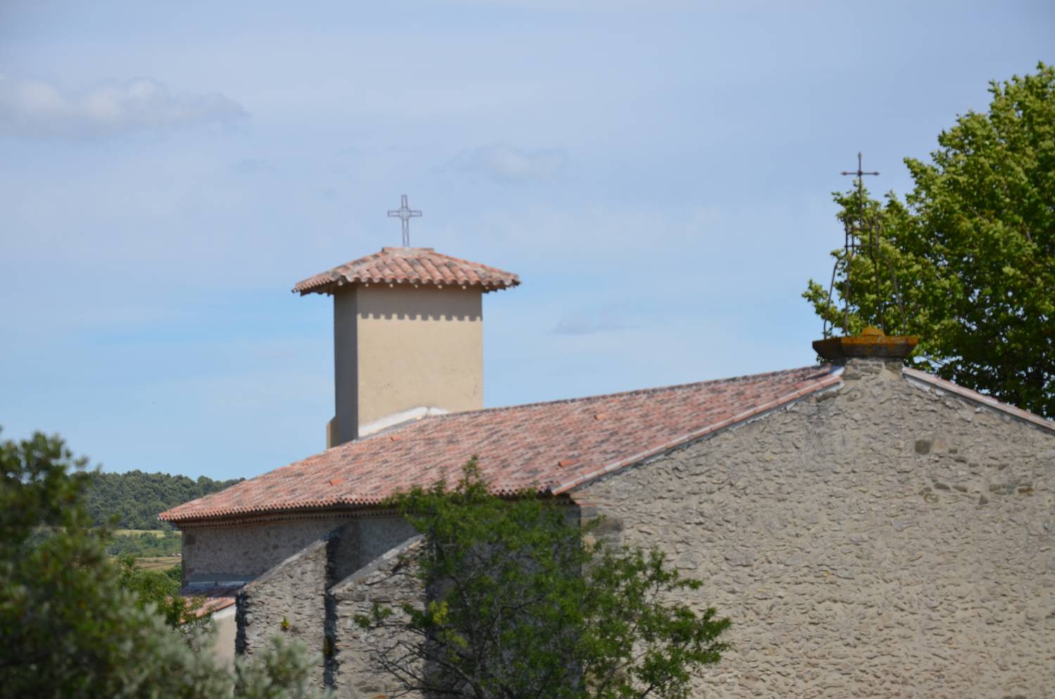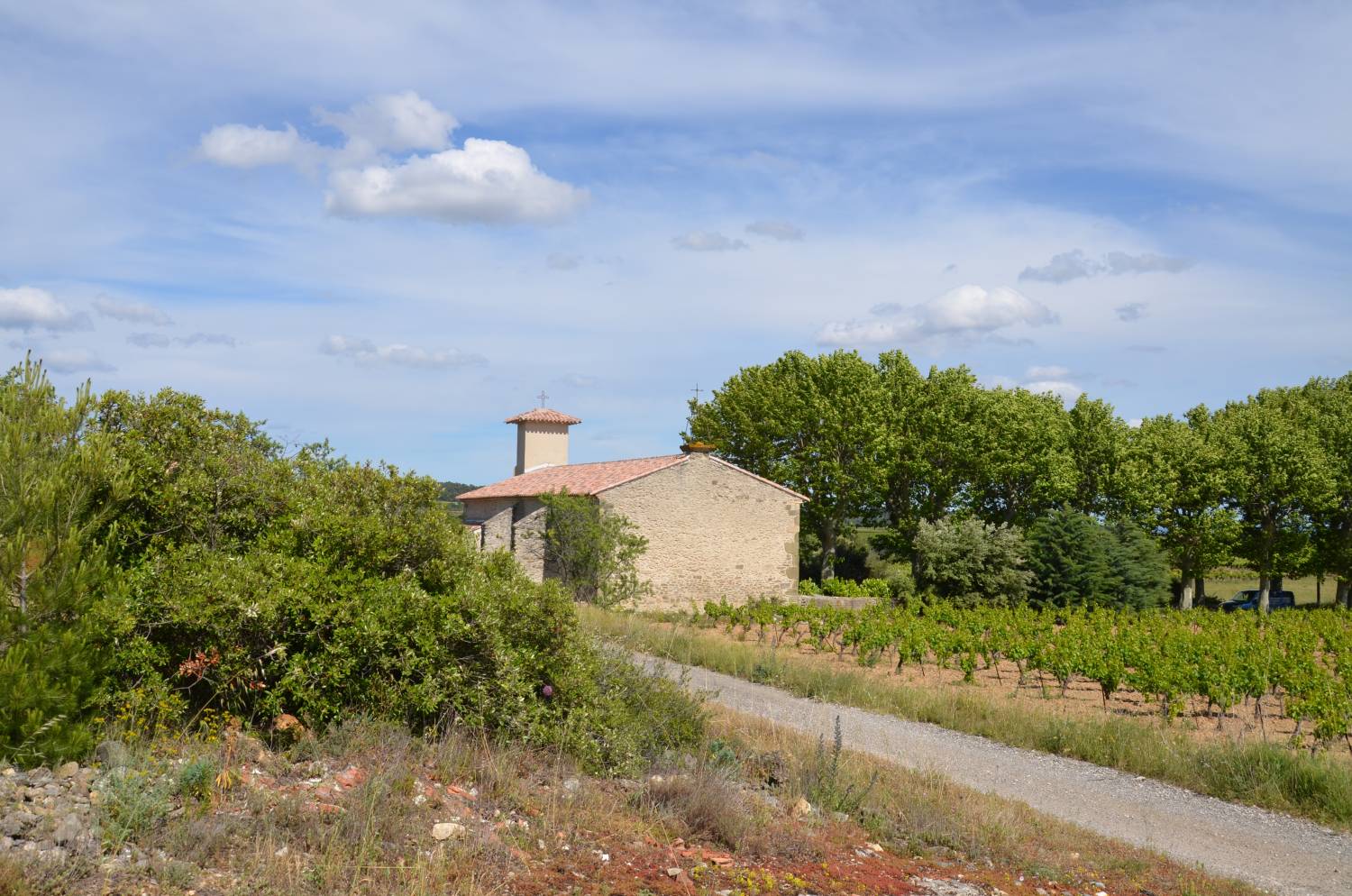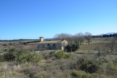 C’est à quelques centaines de mètres au nord du bourg que s’élève la chapelle, adossée à une petite butte couverte de garrigue. L’édifice est précédé d’une majestueuse allée de platanes, qui fait tout le charme du site. On peut imaginer qu’elle a été plantée au moment de la réouverture de la chapelle au culte, au début du XIXe siècle. En effet, comme cela est arrivé souvent, ces lieux de dévotion populaire, mis en vente comme biens nationaux, puisque seuls les édifices paroissiaux étaient conservés dans le domaine public, furent rachetés grâce à des initiatives locales. Ici, après un achat en 1791 pour un simple usage agricole, l’acquisition en fut faite par soixante habitants du lieu, en 1812, pour lui rendre sa vocation première, la fête du saint étant célébrée le 16 août.