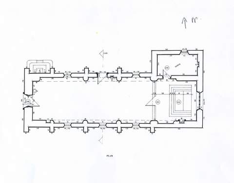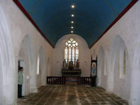 L’intérieur frappe par l’existence, de chaque côté de la nef, de quatre grands arcs murés ; du côté sud, les trois premiers sont percés chacun d’une fenêtre ; de même, du côté nord, les arcs 1 et 3 sont percés d’une fenêtre, mais les arcs 2 et 4 s’ouvrent par une porte. Les voussures des arcs brisés s’amortissent directement dans les colonnes (ce qui daterait la nef du xvie s.). À l’origine, ces arcs ouvraient-ils sur des bas-côtés qui auraient par la suite été supprimés ? Y a-t-il eu un transept dont la sacristie pourrait être l’ancien bras nord et dont un bras sud serait lisible dans l’appareil irrégulier de l’angle sud-est de la chapelle ? Autant de questions auxquelles il est difficile de répondre.