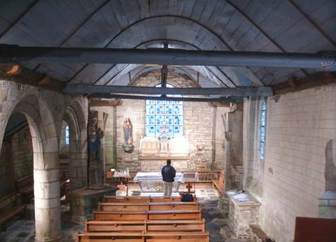À l’intérieur, la nef comprend quatre travées, la première étant murée pour former une sacristie logée dans la partie occidentale du bas-côté. Ce type de plan (une nef avec un seul bas-côté au nord) se rencontre dans plusieurs églises ou chapelles des environs : à Gouézec[1], à Pleyben[2], à Saint-Thois[3], à Édern[4], etc. Les arcades séparant la nef du bas-côté nord reposent sur des colonnes cylindriques à pénétration directe, sans chapiteaux. Les amorces d’un arc diaphragme sont visibles en haut de la nef : sans doute n’a-t-il jamais été construit. Quatre entraits à engoulants dans la nef, et un dans chaque bras du transept, consolident la charpente qui est recouverte d’un lambris. Les baies n’ont conservé que quelques vestiges des vitraux d’origine : la baie 4, notamment, outre les blasons de Kerguz, de Tréanna et de Kergoët, présente encore une Transfiguration remontant au quatrième quart du xve s., tandis qu’une sainte Véronique subsiste dans la baie 6 et une Annonciation dans la baie 8, ces deux dernières datant vraisemblablement de la fin du xve s. ou du début du xvie. L’ensemble de ces vitraux a été restauré vers 1970-1980 par le maître verrier Hubert de Sainte-Marie, de Quintin (Côtes-d’Armor).