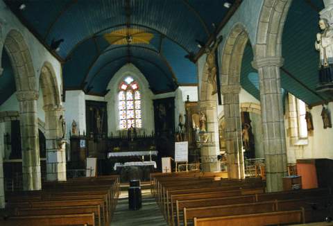 L’église semble avoir été construite en quatre campagnes. De la première effectuée à la fin du XIVe s., reste la nef où se voient encore quatre piliers de l’ »école de Pont-Croix », formés chacun de huit colonnettes tangentes recevant sur leurs chapiteaux décorés de feuillages des arcades en plein cintre. Du XVe-XVIe s. subsistent les remplages des fenêtres du chœur et du transept, remployés lors des travaux de la fin du XVIIe s., lorsque le recteur Jacques Quéré fit reconstruire le transept, ainsi que l’attestent une inscription sur une sablière du bras nord (1681) et une autre sur le mur extérieur du bras sud (1683). Enfin le style – d’une grande sécheresse – du clocher-mur occidental, du porche sud et du chevet laisse à penser que la dernière campagne date de la fin du XVIIIe ou du XIXe siècle.