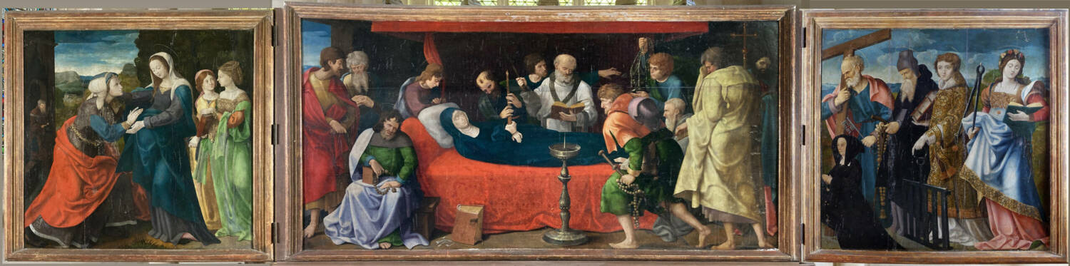La Mort de la Vierge, attribué à Grégoire Guérard (actif entre 1512 et 1538), est un chef-d’œuvre de la peinture franco-flamande, mesurant 5,70 m de long et 1,40 m de haut lorsqu’il est entièrement déployé. Il se compose d’un panneau central représentant la Vierge sur son lit de mort, entourée des apôtres, et de deux volets peints à l’huile, avec des grisailles sur les revers. Les détails sculpturaux des plis, la richesse des couleurs et l’agencement des personnages en plans successifs sont caractéristiques de l’art de Guérard, influencé par les maîtres néerlandais.