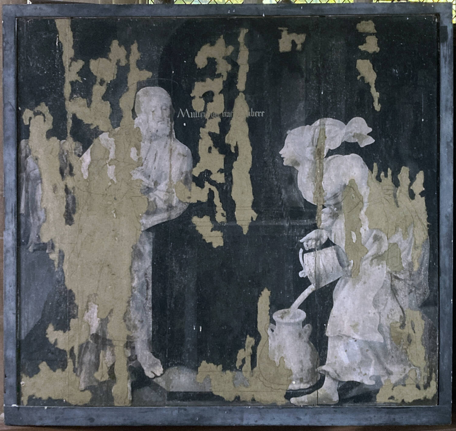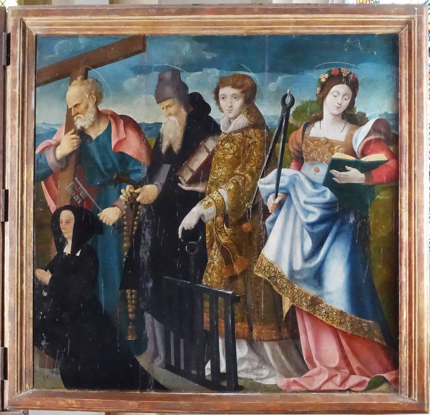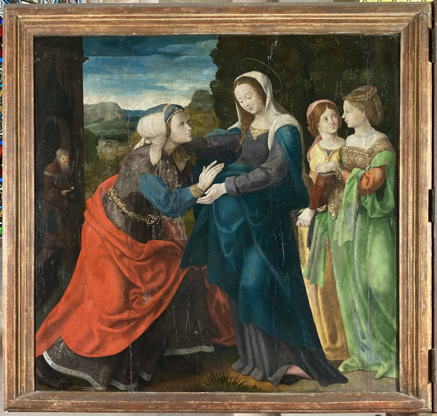 Le volet dextre montre la Visitation avec, au revers, Le Christ et la Samaritaine, tandis que le volet senestre présente une donatrice accompagnée de ses saints patrons, avec au revers la Résurrection de Lazare. Aujourd’hui, le triptyque présente des infestations d’insectes xylophages, des moisissures et des soulèvements de matière picturale sur toutes les surfaces, en particulier sur les grisailles. Le bois des panneaux est fragilisé, et des pertes de matière sont visibles sur certaines parties.