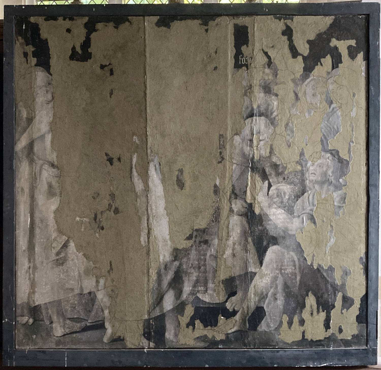 La restauration devrait inclure un traitement curatif contre les insectes, une consolidation des structures bois et un fixage des couches picturales pour éviter les pertes supplémentaires. Un nettoyage minutieux des surfaces et un traitement antifongique sont également nécessaires pour assurer la stabilité de l’œuvre sur le long terme.