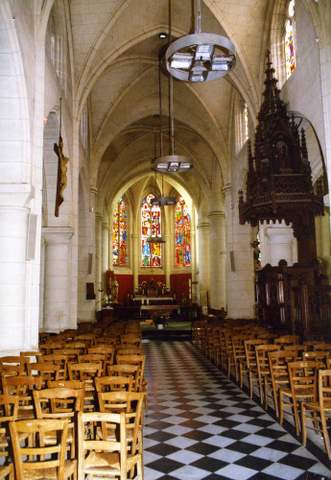 Le vaisseau central de la nef s’élève sur deux niveaux. Les grandes arcades en arc brisé sont rythmées par des colonnes garnies de chapiteaux trapus à la corbeille simplement évasée. Les fenêtres hautes sont pourvues de remplages flamboyants. Les retombées des voûtes d’ogives, dans le vaisseau central comme dans les bascôtés qui ont été élevés sur le même modèle dans les années 1860, s’effectuent sans aucune interruption depuis les clefs jusqu’au sol. Le transept possède une certaine ampleur : chaque bras est doublé vers l’est par une travée de même hauteur qui peut faire office de chapelle ; les voûtes retombent sur des colonnes dotées d’une simple bague. Dans l’abside polygonale, le même traitement régit les retombées des ogives sur des colonnettes engagées. Les remplages des baies aux formes plus adoucies que dans la nef trahissent une date d’exécution plus récente, tout comme la niche ménagée sur le front du contrefort à l’angle nord-ouest du transept, dont le décor d’oves est déjà franchement Renaissance. Cette combinaison de structures gothiques et de formes Renaissance n’est pas rare dans la région. On la rencontre par exemple dans le chœur de l’église d’Ambleny.