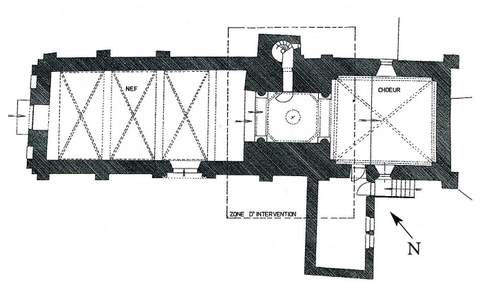 La nef de trois travées est voûtée sur croisées d’ogives. La campagne de restauration entreprise entre 1869 et 1872, comme en témoignent les plans et élévations dressés à cette époque, visa en effet à remplacer la voûte en berceau de la nef par des voûtes sur croisées d’ogives et à revêtir l’ensemble des murs intérieurs d’un décor de faux appareil. En même temps, la construction de colonnes engagées dans la travée droite du chœur permit d’élever de grandes arcades et de dégager les maçonneries existantes afin de couvrir ce plan carré d’une coupole sur trompes.