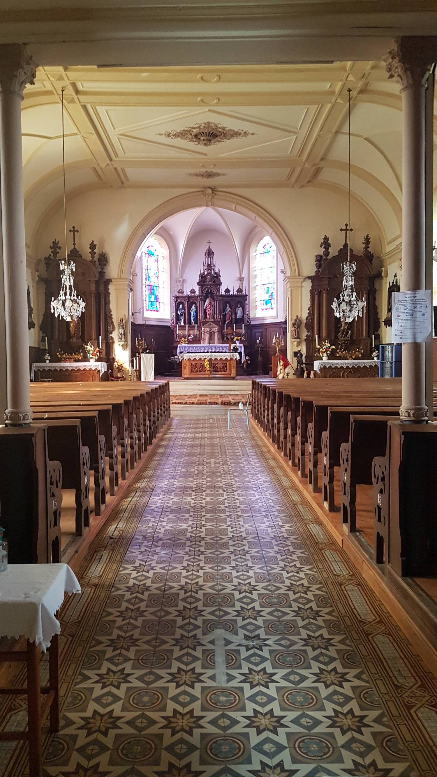 Tandis que la toiture de son clocher, à fortes pentes, est en ardoises naturelles, sa nef est recouverte d’une toiture à deux pans, en tuiles de terre cuite rouge, du type mécaniques, tout comme son choeur.