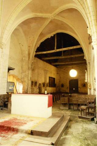 La nef, reconstruite au XVe s., est seulement lambrissée. Elle communique au nord par trois grandes arcades avec le bas-côté voûté d’arêtes. La façade ouest et les parties hautes du clocher datent du XVIIe siècle. Le mobilier classé comprend, outre le vitrail du XIIIe s., un Christ en croix, en bois, du XVIIe s. et une toile représentant L’Assomption avec saint Aubin et sainte Anne qui porte la date de 1696.