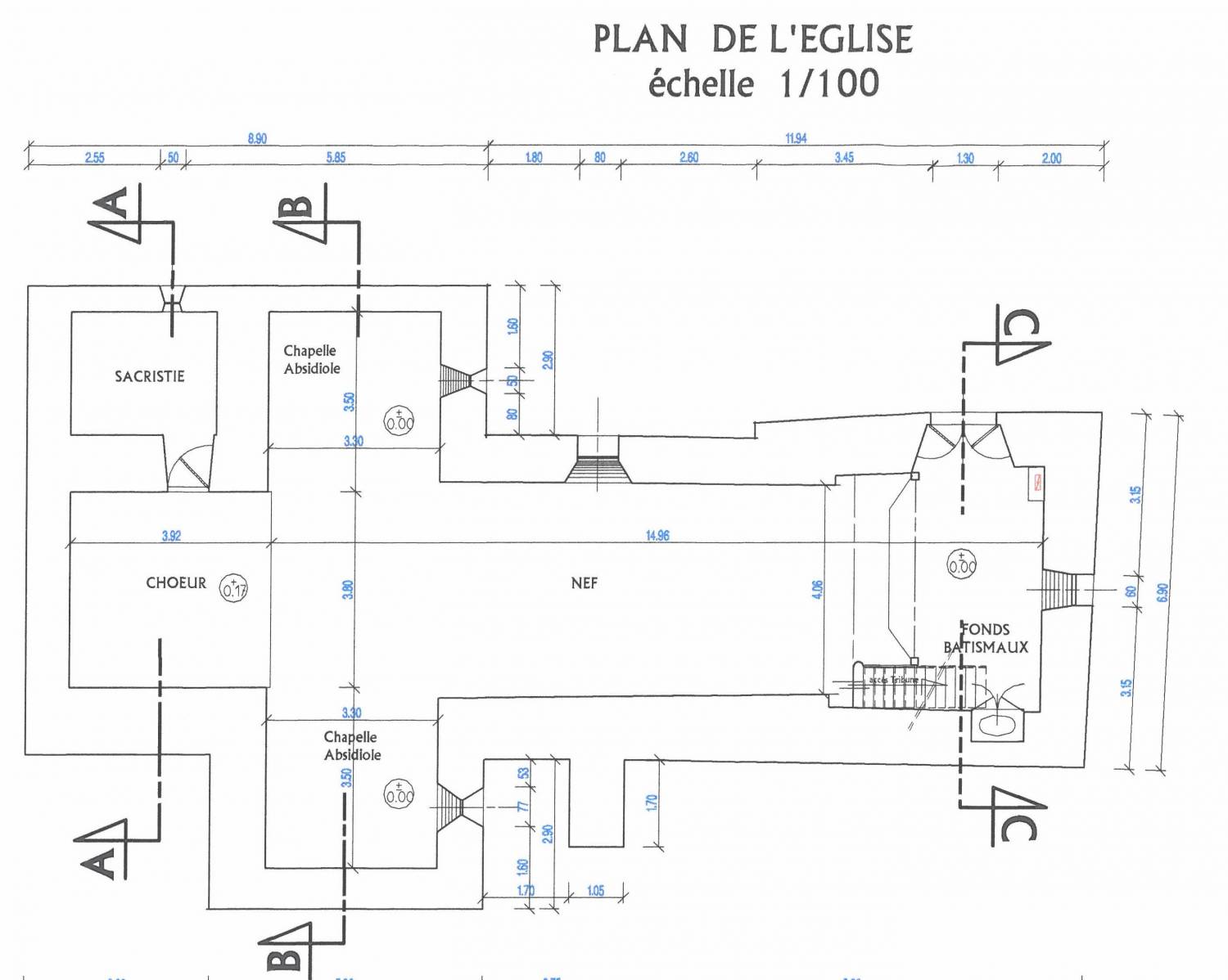 Il s’agit d’un édifice à nef unique voûté en berceau brisé, terminé par un chevet plat., bordé au nord et sud est de chapelles. On y accède par le sud, grâce à une ouverture en plein-cintre. Les murs et les couvertures sont en schiste.