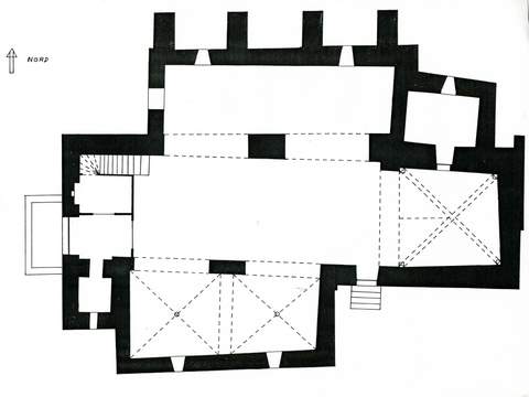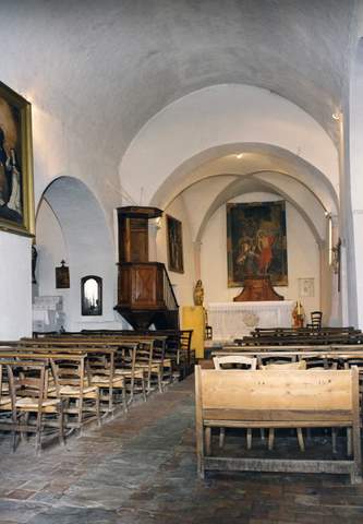 Non loin d’elle se trouvait un château médiéval qui a été rasé (vers 1586) au moment des guerres de Religion. L’église elle-même n’a pas échappé au désastre. Mais on commença dès 1599 à la « rebastir à neuf : On a réutilisé certains matériaux de l’édifice antérieur, notamment dans le chœur. En 1641, l’église est signalée en bon état. Elle comprend une petite nef couverte d’un berceau lisse surbaissé et un chœur rectangulaire voûté plus bas d’une pseudo-voûte d’ogives reçues par des colonnettes engagées. De courts bas-côtés ouverts sur les flancs de la nef amplifient un peu le volume. Cette architecture bâtarde ne saurait se recommander d’une prétendue tradition romane, comme on l’a écrit parfois.