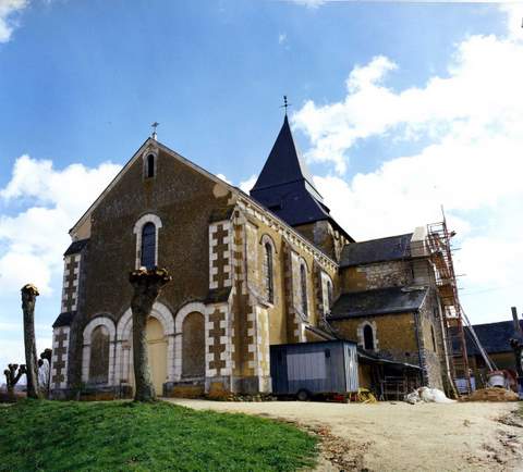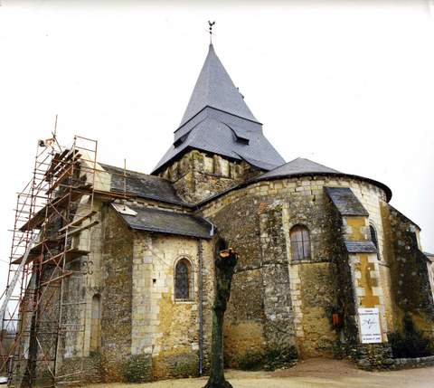 L’église de Vaulandry, placée sous le vocable de Saint Pierre, est signalée dans la bulle de confirmation des biens de l’abbaye de Saint-Serge d’Angers en 1159. L’église adopte un plan en croix latine. Le chœur et le transept datent du milieu du XIIème siècle. La nef primitive qui pouvait remonter au XIème s. a été reconstruite en 1863 en style néo-roman. L’édifice est caractérisé par l’aspect massif du chevet. Le chœur imposant est terminé par une abside semicirculaire, flanquée de deux absidioles. Les baies romanes ont leur cintre souligné par une modénature à décor de chevrons. Une corniche à motif d’arcatures ornée de dents de scie et de rinceaux couronne le mur de l’abside. La corniche repose sur des modillons à figures humaines ou animales selon les infinies variations traditionnelles. Les vicissitudes qu’a connues l’édifice – la tradition rapporte qu’ un incendie a endommagé les parties hautes en 1436 – ont entraîné de très fortes dénaturations qui ne permettent plus d ‘apprécier pleinement la qualité des volumes romans et de leur agencement. Deux contreforts monumentaux absorbant les contreforts romans soutiennent l’abside. Les absidioles ont perdu leur toiture primitive en demi-poivrière et leurs murs ont été exhaussés. La chapelle seigneuriale des Turbilly a été accolée vers 1625 contre la face nord de l’abside. Ces remaniements s ont été menés au XVIIIème s. par les Menon, seigneurs de Turbilly. Les murs-pignons du transept, flanqués de contreforts, sont percés d’une haute baie romane, celle du nord encore dotée de son traitement d’origine avec ébrasement extérieur, piédroits ornés de chevrons. Le clocher, de plan rectangulaire, qui s’élève à l’aplomb de la croisée du transept, a été arasé au niveau du faîte des toitures du transept. Les vestiges de l’étage du clocher ont été coiffés d’un beffroi avec flèche en charpente. Ces vestiges, qui correspondent aux premières assises de pilastres, appartiennent peut-être à un étage inférieur d’arcatures aveugles, à moins que le clocher n’ait jamais été achevé. A l’intérieur de l’édifice, on peut observer la variété des modes de voûtement des parties romanes, et le volume de la croisée du transept de plan barlong. Cette dernière est dotée d’une coupole de forme ovoïde, élevée probablement au XIIème s., soutenue par des arcs et des pendentifs qui reposent sur quatre hautes colonnes à chapiteaux ornés de feuilles d’eau. L’arc oriental de la croisée, surbaissé, ouvre sur le chœur couvert d’un berceau plein cintre. L’abside ainsi que les deux absidioles sont voûtées en cul-de-four. Le bras sud du transept est couvert d’une voûte en berceau légèrement brisé tandis que le bras nord est voûté sur croisées d’ogives. Il est malaisé d’établir la chronologie de reconstruction de ces voûtes. La sculpture des chapiteaux révèle des disparités de facture qui s’expliquent par les restaurations de 1863. L’accent particulier apporté au traitement de la croisée du transept, combinée à un chœur important, caractérise cet édifice donc les extérieurs témoignent d’une histoire tourmentée. La chapelle seigneuriale renferme l’intéressant monument funéraire en pierre de François de Menon et Madeleine de la Tour-Landry son épouse, élevé en 1627. Deux angelots en terre cuire assis sur le tombeau sont séparés par deux palmes en fer forgé. Les travaux pour lesquels la Sauvegarde de l’Art Français a octroyé une subvention de 40 000 F en 1995 ont consisté en la réfection de la toiture du versant est du bras sud du transept ainsi que la restauration du mur-pignon, plus précisément les glacis des deux contreforts et ses rampants.