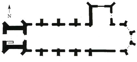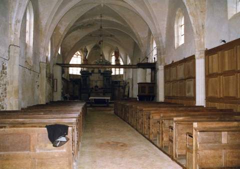 La nef de quatre travées est éclairée de baies dépourvues de remplages. Les voûtes d’ogives reposent sur des colonnettes engagées groupées en faisceaux aux savantes ondulations. Le sol, exhaussé à l’époque moderne, était à l’époque de la construction plus bas d’une trentaine de centimètres comme l’indiquent des vestiges de dallage à carreaux de terre cuite découverts en 1994, dont quelques éléments sont conservés à la mairie.
