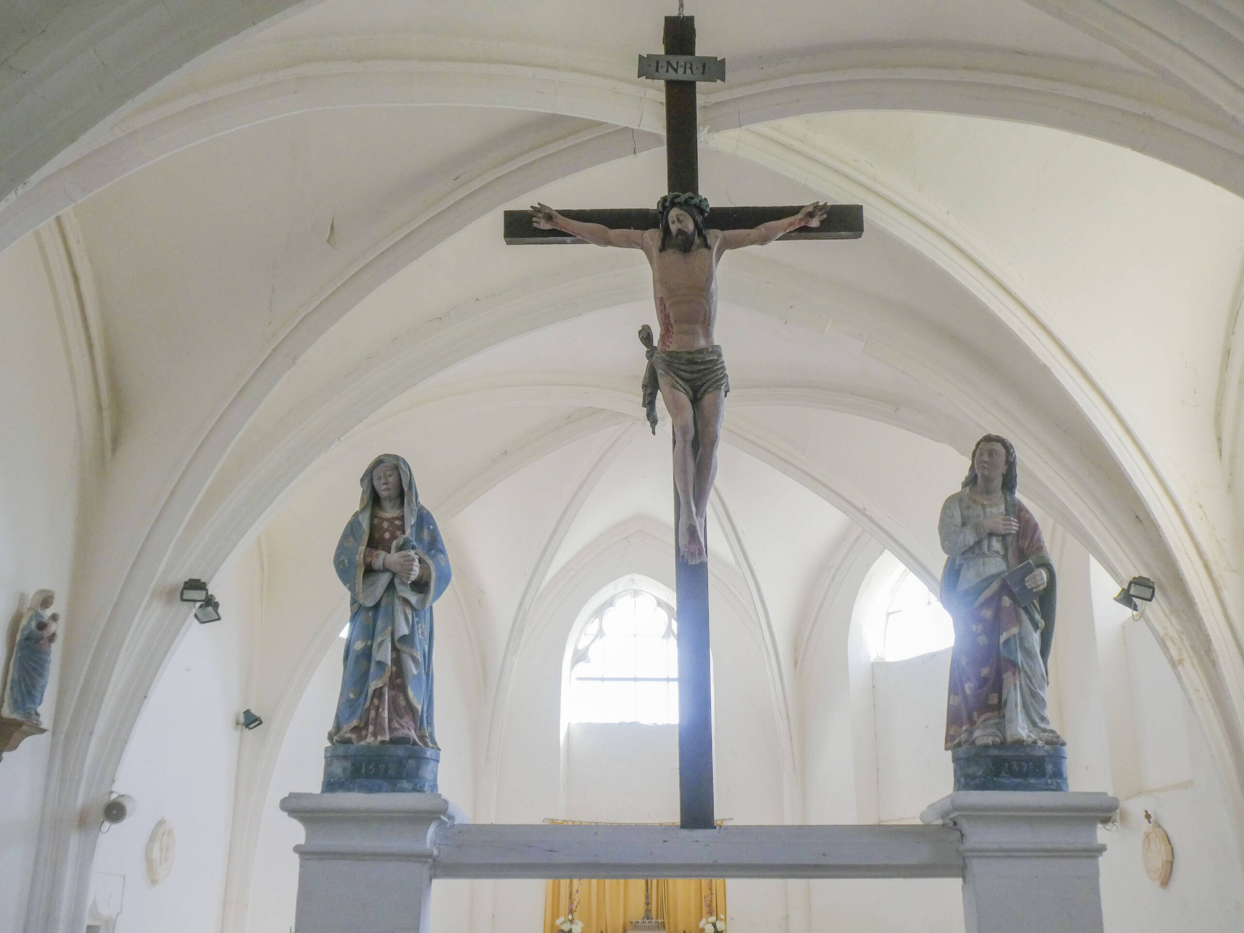 La nef de l’église est partagée en deux au tiers de sa longueur par une séparation constituée d’une poutre de gloire reposant sur deux piliers. Comme l’atteste de vieilles cartes postales et des gonds toujours en place, deux porte en bois fermaient le passage entre les piliers. La datation de cet ensemble est délicate, la statuaire imposante est composée d’un Christ en croix, sans doute du XVIIe siècle, et de deux grandes statues représentant saint Jean et la Vierge Marie qui portent la date de 1598 sur leurs socles.