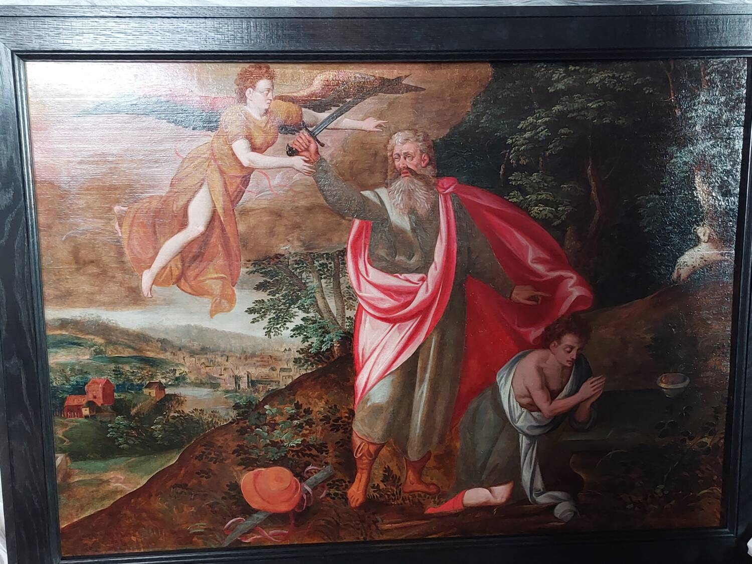 Ce tableau du XVIIe siècle est arrivée en quatrième position ex aequo dans le suffrage des lycéens. La scène représentée est l’une des plus célèbres de la Bible. Abraham, premier des prophètes, fut missionné par Dieu lui-même afin de peupler la Terre Promise, s’étendant du Nil à l’Euphrate. Mettant à l’épreuve la foi du Père de toutes les Nations, le Tout-Puissant lui ordonne de sacrifier son unique fils, Isaac, né de Sarah. Pendant trois jours, Abraham gravit le sommet du Mont-Moriah et s’apprête à sacrifier son seul enfant. C’est alors que surgit un ange envoyé par Dieu, désormais convaincu qu’il est craint par Abraham ; il lui demande de laisser son fils sain et sauf. Par son caractère dramatique, celui d’un instant figé à l’interstice de la vie et de la mort, à la frontière du ciel et de la terre, tiraillé entre l’humain et le divin, cet épisode déchirant fut une source d’inspiration artistique foisonnante. De Rembrandt au Caravage en passant par la plus humble des toiles de la plus petite église, la pièce exposée à Vert-en-Drouais constitue un témoignage et une représentation originale d’un des mythes bibliques les plus célèbres et les plus symboliques.