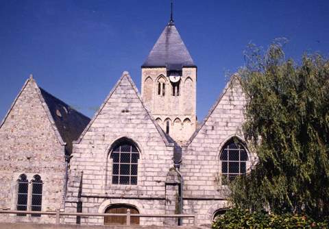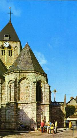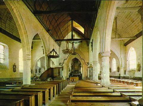 – l’abbé Cochet a découvert sur le mur latéral de la chapelle nord une inscription de 1272 – a été le premier reconstruit au début du XVIe s. La nef principale porte sur une de ses sablières la date de 1528. D’autres travaux, aux environs de 1587 , concernent l’ensemble du chevet. Les charpentes des trois nefs ont été refaites en 1609 ; en 1628 fut établi le jeu d’orgues réparé récemment. A l’exception du carré sur lequel s’élève le clocher qui est voûté d’ogives (dissimulées par un faux plafond), l’église est couverte par des voûtes de bois en carène renversée. Les collatéraux sont séparés de la nef principale par de grandes arcades retombant sur des piles surmontées de chapiteaux. Celles du sud ont reçu un riche décor sculpté, très complexe. Pour la mise hors d’eau, la Sauvegarde de l’Art Français a attribué trois subventions de 1991 à 1992 (100 000 F – 100 000 F- 80 000 F).