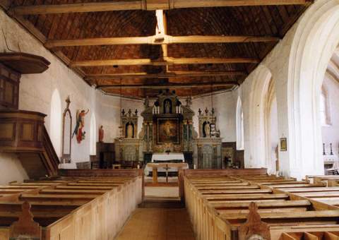 A l’intérieur, le bas-côté est voûté sur croisées d’ogives alors que la nef est couverte d’une charpente en vaisseau habillée d’un bardeau. Les murs du chœur ainsi que ceux des bas-côtés sont percés de baies en arc brisé à remplage flamboyant. L’un des vitraux date de 1541.