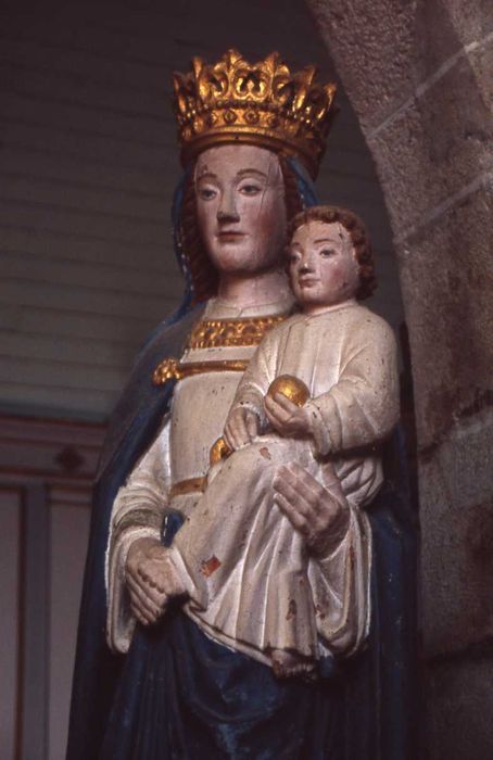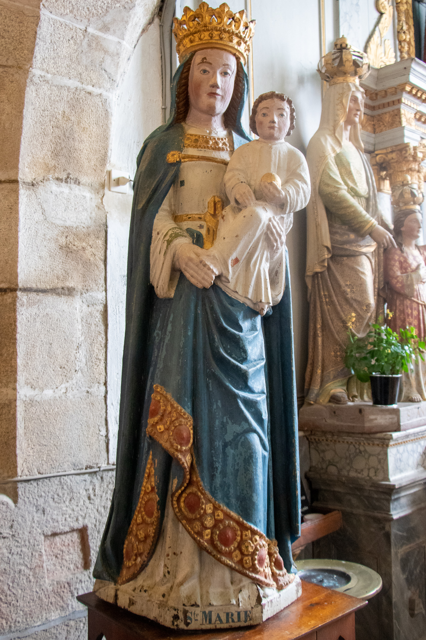 A la fin des guerres entre le Royaume de France et le Duché de Bretagne, le mariage d’Anne de Bretagne avec Charles VIII, puis Louis XI marque le début d’une phase de prospérité, durant laquelle de nombreux nobles vont faire édifier, modifier et décorer des édifices religieux, sous leurs prééminences et patronages. Cette pièce en chêne polychrome est réalisée à cette période. François le Houx, membre de la haute noblesse bretonne est très probablement à l’origine de la commande de la Vierge à l’enfant et des trois autres statues présentes dans l’église. Cette statue possède des beaux orfrois sculptés avec finesse sur les vêtements. Les mains de la Vierge sont fines et anatomiquement justes, ce qui atteste d’une réalisation maîtrisée