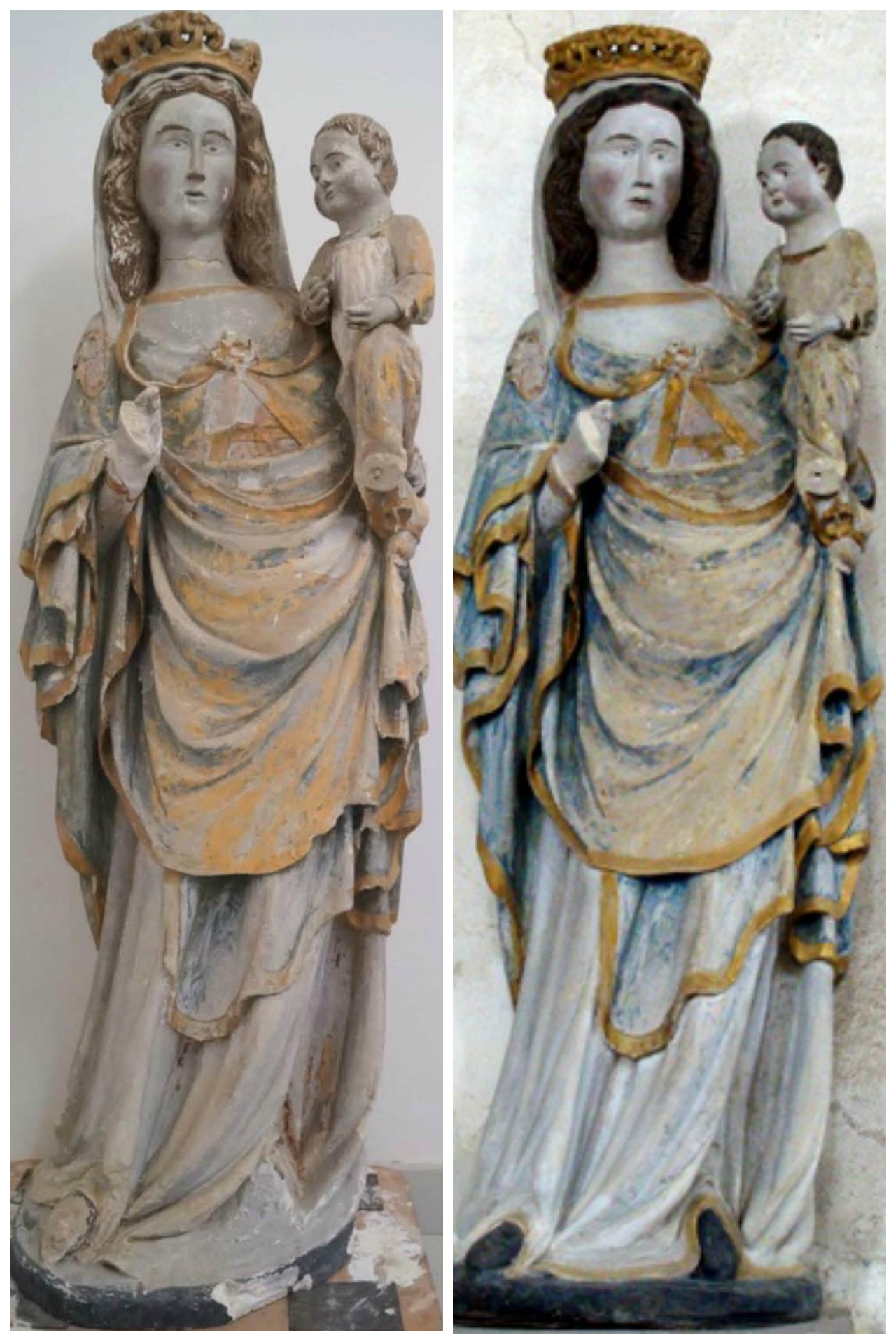 Située sous une baie vitrée qui présentait des risques d’infiltration d’eau de pluie voire de chute de gravats, la situation de la statue ne lui permettait pas une bonne conservation. Par ailleurs, la Vierge hanchée était très abîmée. Plusieurs parties étaient manquantes ou brisées. La statue avait semblait- t-il fait l’objet de réparations maladroites aux époques antérieures : les mains de l’enfant étaient en bois et les lacunes avaient par endroits été recouvertes de plâtre. La polychromie était très encrassée et fragile. L’intervention du restaurateur a donc eu pour objectif de nettoyer la statue et de lui rendre sa polychromie d’origine. Les parties manquantes ont été reconstituées. Après la restauration, la statue a été déplacée et convenablement mise en valeur. Un projet mobilise actuellement la ville et la paroisse de Châteaubriant afin de procéder à une rénovation de l’église Saint-Jean-de-Béré, chef d’œuvre de l’art roman.