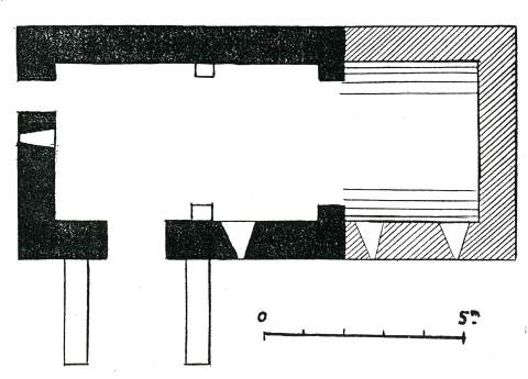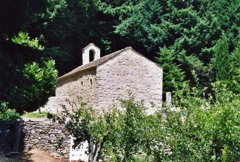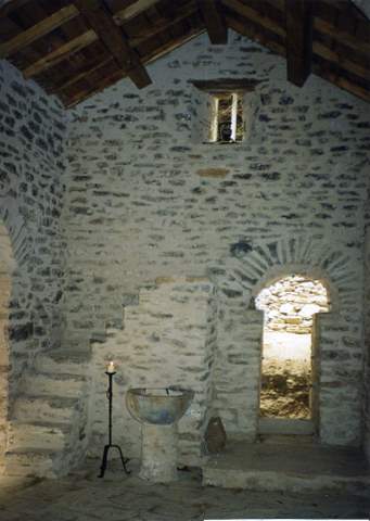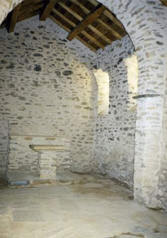 L’édifice lui-même est on ne peut plus simple : une nef rectangulaire, à chevet plat. On distingue dans la maçonnerie la trace d’un agrandissement, vers l’est, qui a augmenté l’édifice d’un bon tiers. L’ensemble est bâti en schiste brut. On remarquera que dans la partie primitive, il n’existe qu’une seule baie, de petites dimensions, bâtie en tuf de rivière : les quelques pierres qui la constituent sont (comme celles de deux autres de la partie plus récente) les seules pierres travaillées de l’édifice. Il subsiste une petite porte à l’ouest, couverte d’un arc à gouttières, plutôt évocateur d’une période haute (Xe siècle ?), mais il est difficile de se prononcer. La porte méridionale, précédée des restes d’un porche sans doute moderne, a été modifiée et élargie ; mais on y voit un arc de décharge qui peut suggérer l’existence d’une porte autrefois couverte d’un linteau monolithe.