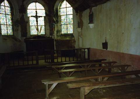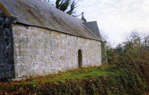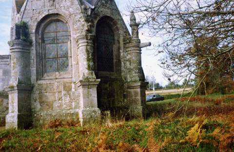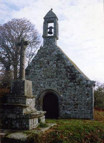 La chapelle de la Trinité, basse et trapue, forme avec le calvaire et la fontaine en contrebas un ensemble charmant avec son bel appareillage de granit. Le plan de la chapelle est fort simple : de forme rectangulaire, elle se termine par une abside à trois pans. S’il est difficile de dater la nef, dont l’état actuel laisse à penser qu’elle a pu être édifiée à la fin du XVIème s. ou au début du XVIIème s., l’abside, en revanche, par son décor extérieur et par la date de 1688 qui y figure, témoigne d’une campagne de travaux de la fin du XVIIème siècle. La façade occidentale est surmontée d’un clocheton dont la base déborde légèrement de son support ; peut-être aura-t-il été rapporté. Les murs goutterots ne sont percés d’aucune fenêtre ; seules deux portes, l’une dans le pignon occidental, l’autre dans le mur sud, viennent rompre le parfait alignement des pierres de granit. On remarque à la base du toit la trace, à intervalles réguliers, des entraits qui scandaient la voûte lambrissée ; ils ont de nos jours disparu, sciés à une époque inconnue, entraînant un dévers des murs. Le chevet est rythmé par trois pans, chacun traité à la façon d’un gâble au centre duquel est percée une ouverture cintrée ; de curieux contreforts l’épaulent ; sur une base rectangulaire dont la corniche est moulurée, se dresse un piédroit de forme semi-circulaire, lui-même amorti d’une sculpture le couronnant et doté d’une bouche à feu.