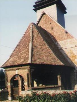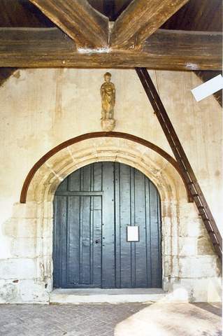 À la Renaissance, des embellissements témoignent d’une vie plus facile : le cimetière est alors doté d’une croix monumentale en pierre sculptée et la façade ouest de l’église est agrémentée d’un portail à la mode, en anse de panier et chambranle souligné de grès mouluré. Ce portail est précédé d’un porche à cinq pans qui couvre tout l’espace situé entre les portes de l’enclos et le portail de l’église ; véritable corps de passage, il dessert également le cimetière par des baies libres sur les côtés. Il est construit en pans de bois de chêne et toutes les poutres sont moulurées, creusées de cartouches, aux motifs géométriques et végétaux. Chapiteaux et modillons de la corniche intérieure sont ornés de feuillages. La charpente comporte des jambettes et des aisseliers courbes sur lesquels est appliqué un lambris de couvrement. Au centre, le poinçon est sculpté d’oies dans un panier. Ce curieux motif est une allusion aux oies de saint Martin qui trahirent sa présence dans une ferme où, nouvellement élu évêque, il était venu se retirer pour prier.