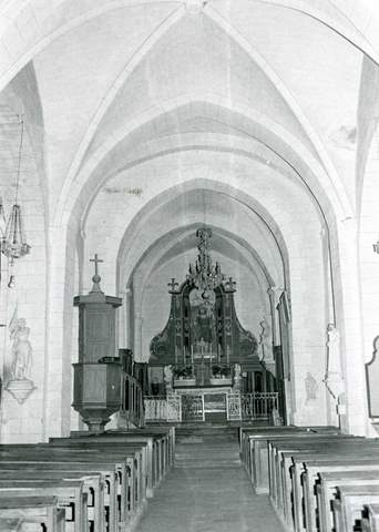 Église paroissiale. Dossier présenté par M. le chanoine Marilier, notre délégué régional pour la Bourgogne. Cette église n’est pas sans importance puisqu’elle mesure 47 mètres de longueur, mais elle est fort composite. La nef a été reconstruite au xviiie siècle. Une travée romane couverte d’un berceau en plein cintre débouche sur un chœur important dont les croisées d’ogives remontent au xive siècle. On remarque deux pierres tombales de cette époque, et un retable décorant le mur droit du chevet, daté de 1707. Plusieurs statues de la fin du xve et du xvie siècle ont été déposées provisoirement dans le musée diocésain. Pauvrement bâtie et sans décor extérieur, cette église de village se confondrait avec la grande ferme voisine et les maisons du bourg, si son porche d’entrée n’était surmonté d’un clocher massif qui semble remonter au xvie siècle. Ce clocher orgueilleux a certainement été construit moins dans un but utilitaire que pour donner au temple chrétien le symbole d’une puissance spirituelle analogue au donjon des châteaux contemporains, symbole de la puissance matérielle. La réparation des toitures s’élève à une somme importante. Nous accordons une subvention de 20 000 F.