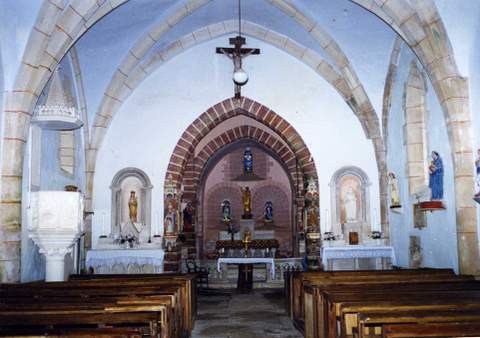 La travée droite de chœur qui supporte le clocher communique avec la nef, et avec les deux petites chapelles qui la flanquent, par des arcs brisés en pierres appareillées, au simple profil rectangulaire, décoré à l’intrados d’un tailloir en quart de rond. Sa voûte en berceau transversal est renforcée d’un arc formant bandeau, tandis que les chapelles sont couvertes d’une voûte en berceau brisé. L’abside, sur plan carré, est voûtée d’un berceau longitudinal légèrement brisé. Les fenêtres qui éclairent la travée de chœur et l’abside latéralement, sont de petite taille, en plein cintre et à profond ébrasement intérieur ; les fenêtres des chapelles sont inégales, étroites au nord, plus larges au sud ; le mur de chevet est percé de deux baies jumelles, surmontées d’une plus petite aux limites de la voûte.