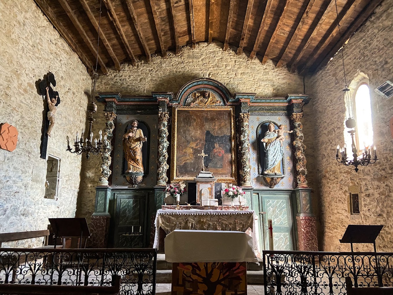 À l’intérieur, l’élément le plus remarquable est le retable baroque du XVIIe siècle, inscrit, attribué à l’atelier du sculpteur carcassonnais Melair, collaborateur du célèbre atelier Parant-Melair actif entre Toulouse et Perpignan. Ce retable présente un tableau central de l’Annonciation, encadré de colonnes torsadées (salomoniques) et de deux statues latérales. Il reflète à la fois le style baroque local et la présence seigneuriale de l’évêque de Carcassonne à Villedubert, notamment sous Armand Bazin de Bezons, prélat influent du XVIIe siècle.