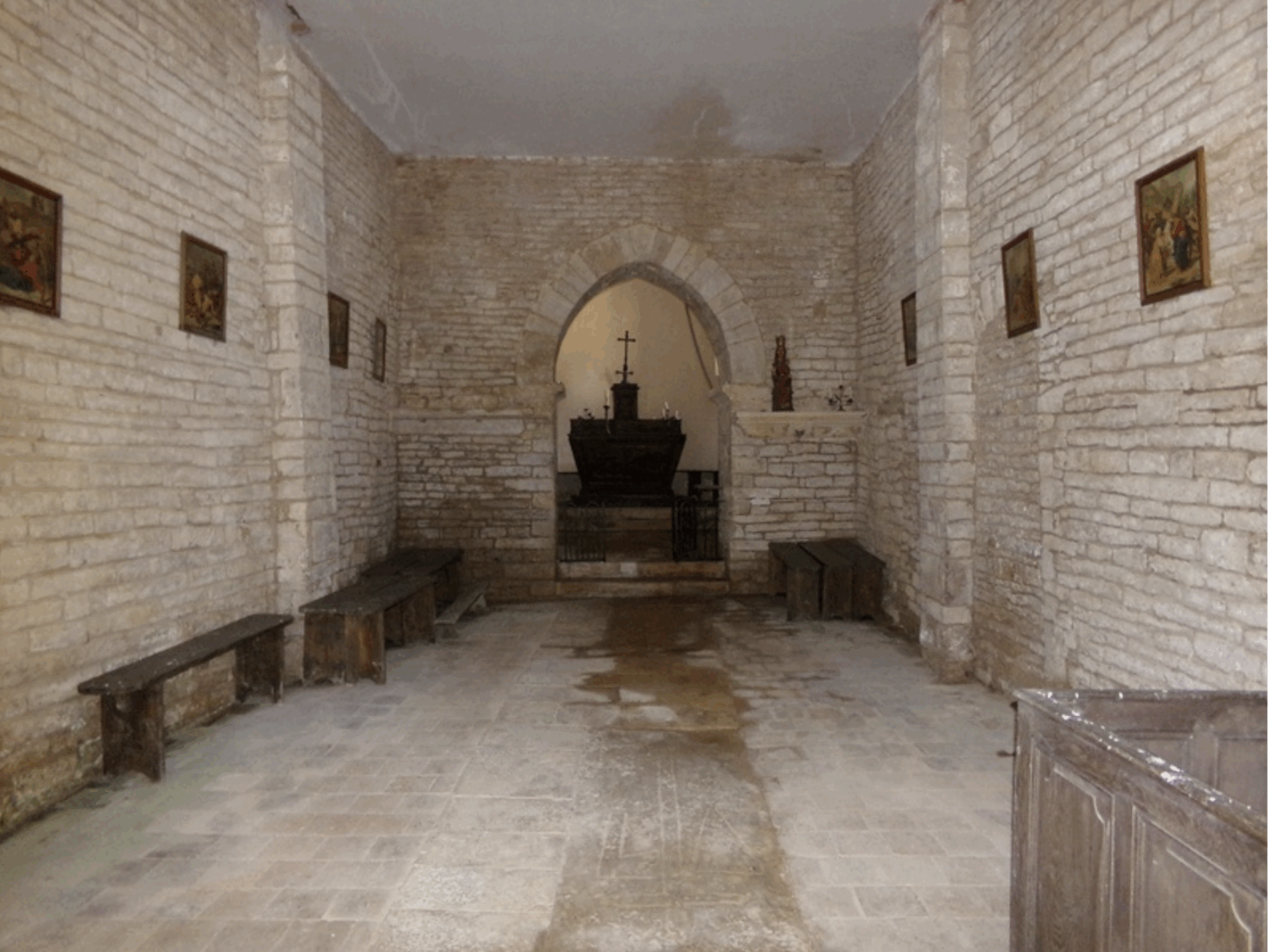 Depuis, la chapelle de la Nativité orientée est située non loin du château, à l’entrée du village. Esthétiquement, elle est couverte d’un toit en tuiles plates, à deux versants avec à l’ouest une demi-croupe portant un clocher en charpente coiffé d’une flèche en ardoises. L’accès à l’édifice se fait par une porte à deux vantaux, prise dans un encadrement en plein cintre. Les baies sont elles aussi en plein cintre. La chapelle est divisée en deux parties : une nef et un chœur liturgique, tous deux couverts d’une fausse voûte à caissons en plâtre reposant sur des consoles et des culs-de-lampe décorés de motifs d’acanthes.