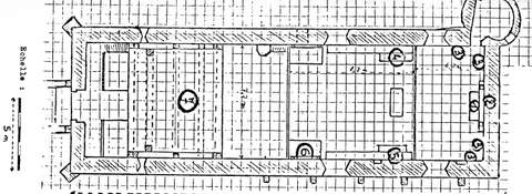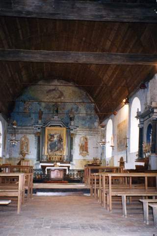 Deux marches assurent la transition avec le chœur éclairé au nord comme au sud par deux fenêtres plus basses et plus grandes, facilement datables du XVIe siècle. Une cinquième fenêtre était percée dans l’axe du chevet plat, mais a été bouchée au moment de la mise en place du retable. Le chœur est recouvert, comme la nef, d’une voûte en plein cintre et en bois reposant sur une poutre couronnant le mur gouttereau. Des tirants de métal ont été ajoutés pour éviter le déversement des murs. Dans la longue tradition des églises peintes de Puisaye, l’église de Villeneuve-les-Genêts a dû connaître plusieurs décors que des sondages ou des enduits friables laissent deviner , dans la nef comme dans le chœur. Le plus complet, qui est aussi le plus récent, est celui du XVIIIe s., sur lequel on lit au moins une date 1782 et un nom Zanot. Le retable du maître-autel, portant un tableau de l’Assomption, est complété par des peintures en trompe-l’œil : boiseries, arcs appareillés, niches dans lesquelles ont été peints saint Pierre, saint Paul et saint Jean-Baptiste, tandis que Dieu le Père, entre deux anges agenouillés, figure dans la partie haute de l’arc en plein cintre. Entre les deux baies latérales, une scène dans un gros cadre mouluré représente en vis-à-vis l’Annonciation, au nord, la Nativité, au sud. Accolée à l’angle nord-est de l’église se trouve une tour circulaire en petit appareil et coiffée d’une toiture conique. Si elle sert aujourd’hui de sacristie, c’est visiblement un élément qui avait une autre destination, mais qui confirme pour tout cet ensemble le XVIe siècle.