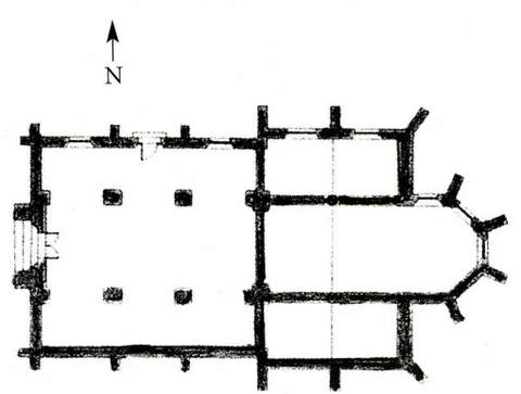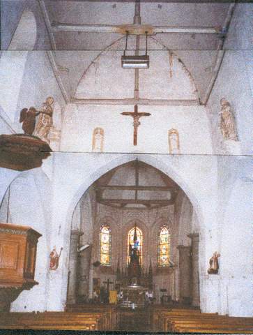 La nef à trois vaisseaux séparés par des piliers quadrangulaires, de type halle, comporte trois travées. Initialement le vaisseau central recevait un éclairage direct comme l’indiquent les deux baies en plein cintre percées au droit des piliers médians. Ultérieurement, peut-être au XVIe s., la toiture des bas-côtés a été relevée, ce qui entraîna l’aveuglement des baies. La charpente du vaisseau central avec entraits et poinçons apparents est ancienne.
