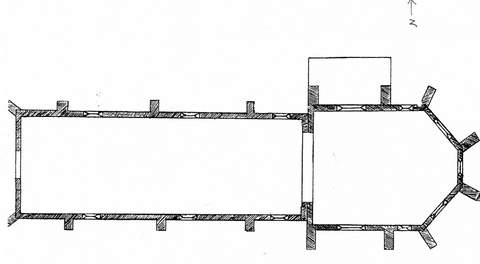 Le traitement des volumes à l’extérieur témoigne d’une véritable recherche : l’abside polygonale est épaulée par des contreforts saillants qui se rétrécissent par trois fois grâce à des ressauts : le premier n’est que le prolongement de l’appui taluté des baies, et le troisième celui de l’archivolte qui coiffe les fenêtres. L’unité de l’ensemble se trouve renforcée par la présence d’une moulure continue à la base des murs. La partie sommitale des contreforts est rendue plus élégante grâce à la mouluration des arêtes et la présence de chaperons incurvés. Tous ces éléments révèlent un chantier ambitieux, resté toutefois interrompu. Il fallut se résoudre à clore le chœur d’un mur-pignon, désormais percé d’une arcade en plein cintre pour communiquer avec la nef moderne.