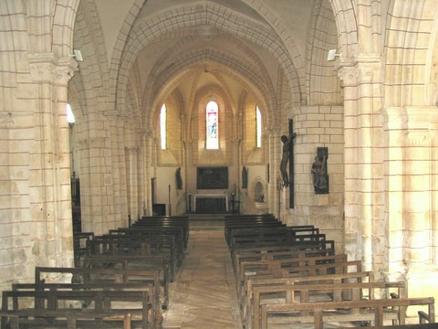 L’église présente un plan en croix latine. Précédée d’une façade-pignon sur laquelle est venu se greffer un portail à large voussure courbe sous fronton au XVIIIe s., la nef à trois vaisseaux de trois travées présente une nette dissymétrie dans le traitement de chacune de ses moitiés nord et sud où subsistent des vestiges de l’église romane dans les piliers cruciformes, notamment dans la dernière travée du bas-côté nord, voûtée d’arêtes, sous le clocher. Les bas-côtés ont été élargis et voûtés à l’époque moderne, sans doute en même temps qu’on reprenait le couvrement du vaisseau central, aveugle, à l’instigation des seigneurs du lieu dont les armes figurent sur les clefs et quelques pierres tombales dans les bas-côtés.