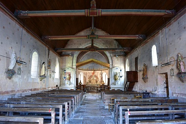 De nombreux remaniements de l’église sont anciens : la surélévation de la toiture, le percement de deux baies à remplage au XVe ou XVIe siècle à côté des autels secondaires, remplaçant sans aucun doute des baies plus anciennes, la surélévation ou la reprise du mur du chœur, le percement d’une porte latérale au sud et la modification de la fenêtre au-dessus… Il est cependant possible d’imaginer qu’on a surélevé le mur pignon au moment où on a installé la voute en bois ainsi que les trois entraits qui divisent l’espace. Le quatrième aurait pu être scié, ainsi que le poinçon, pour élargir l’arc donnant sous le clocher et dans l’avant nef. Des anges portant un écusson auraient été placés sur la coupure pour la cacher.