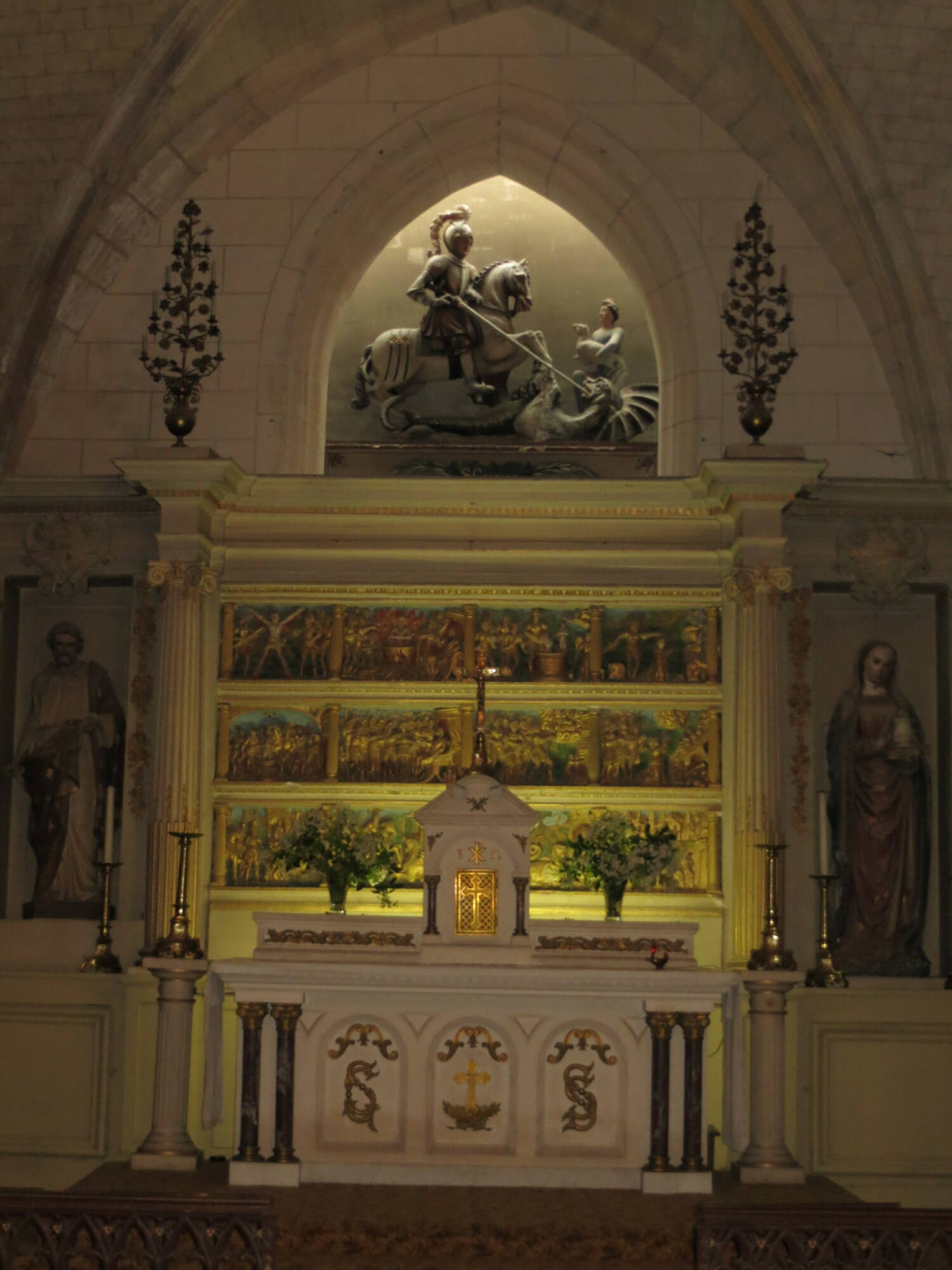 La porte ogivale du XIIIᵉ siècle est encadrée par six colonnes aux chapiteaux sculptés de feuillages. À l’intérieur, la nef voûtée en bois et le chœur à voûtes d’ogives du XVᵉ siècle constituent les éléments les plus remarquables. À droite du chœur se trouve la chapelle dite « Notre-Dame de la Pitié », également du XVᵉ siècle, décorée d’une arcature gothique surmontant la Vierge portant le corps du Christ. On y trouve également une statue de Sainte Madeleine du XIIIᵉ siècle et, derrière le grand autel, un retable en pierre de la Renaissance illustrant le martyre des premiers chrétiens et la légende de saint Georges.