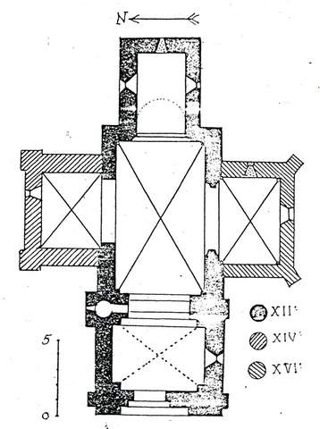 Église paroissiale, jadis prieuré. Monsieur Jean Secret, conservateur des antiquités et objets d’art du département de la Dordogne, nous a donné des renseignements très précis sur cette intéressante église qui a été inscrite à bon droit sur l’inventaire supplémentaire des Monuments historiques en 1925. C’était un prieuré sous le vocable de saint Martin qui avait été fondé par les Augustins de l’abbaye de Saint-Amand-deColy. La structure du monument est très originale. Certes, les chapelles latérales qui donnent l’apparence d’un transept ne datent que des XIVe et XVIe s. mais l’assez longue nef, couverte originairement d’un berceau comme le sanctuaire, remonte au XIIe s.