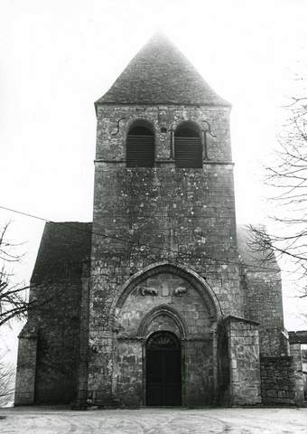 Dans son état actuel, le clocher-porche n’est pas antérieur au XVIe s. mais il a remplacé un porche roman dont la façade occidentale a été décorée avec une si curieuse recherche que seule une photographie – et non une description – peut en rendre compte. Les animaux figurés dans le grand tympan supérieur sont des lions ou des léopards. De l’auvent qui abritait cette ambitieuse et assez belle composition sculptée, il ne reste qu’une partie du mur sud avec un enfeu destiné à un tombeau dont il ne semble pas demeurer de vestiges.