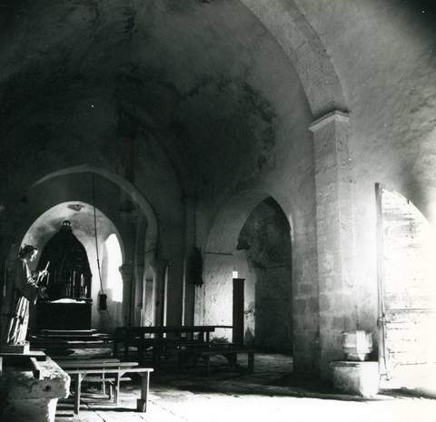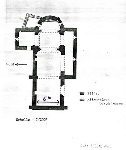 L’édifice remonte au xiie s. et il est de belle qualité. Il est judicieusement décrit dans les lignes suivantes qui ont pour auteur notre délégué régional, M. de Bussac, conservateur régional des Bâtiments de France, qui nous a fait parvenir un dossier exemplaire, comportant non seulement des devis détaillés mais de très nombreux documents graphiques. « Dans le principe, cette église comprenait une abside semi-circulaire et une nef unique. La voûte de celle-ci, sans doubleau, est plein cintre près de la croisée, mais reprise plus bas. Sa courbure se brise et, probablement à l’époque de cette réfection, le goutterot méridional a été percé de trois arcs en tiers-point pour donner accès à un collatéral ajouté alors sous-voûte en quart de cercle.