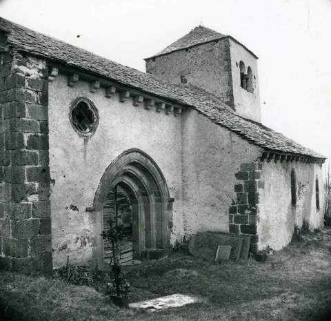 La porte au midi dans la deuxième travée du collatéral est un arc brisé et très sobre d’ornements. La toiture à deux pentes en lauses repose sur un entablement droit posé sur des modillons dont quelques-uns sont à enroulements, mais la plupart portent un simple quart de cercle. Enfin, une tour rectangulaire s’élève en clocher au-dessus du carré du transept, ajouré de baies géminées, et renfermant une cloche de 1523.