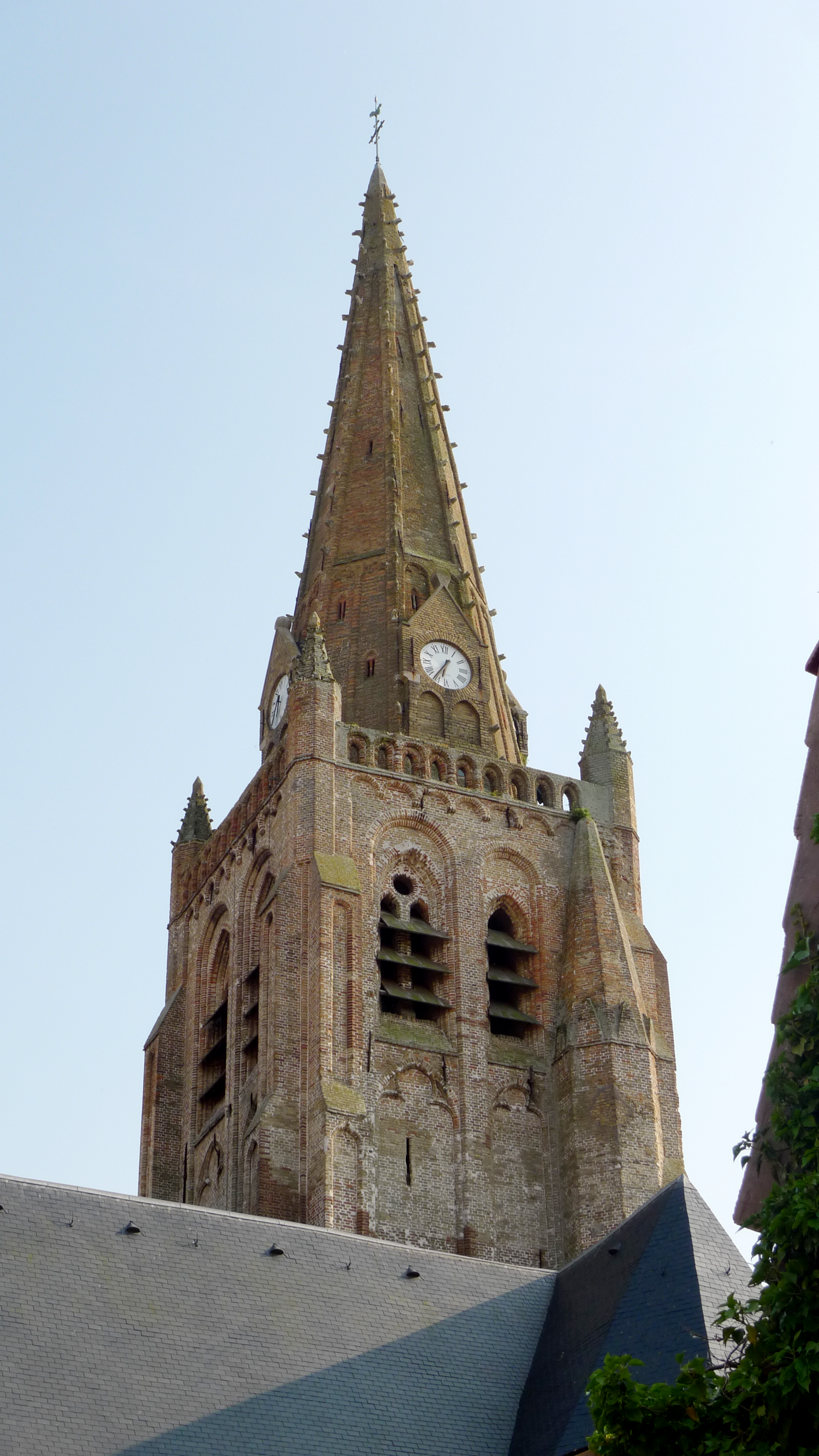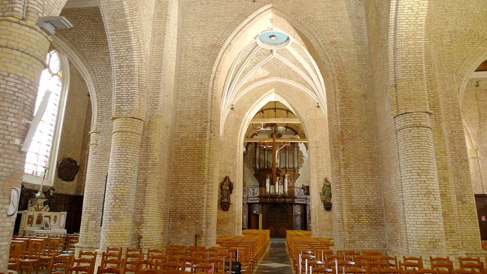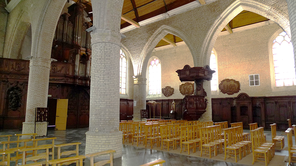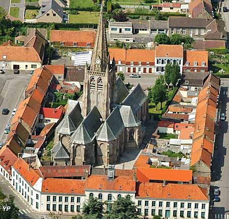 Les premiers offices religieux y ont été célébrés en 1208 par Bauduin Samuel, moine de l’abbaye de Bergues. Depuis sa construction, l’église n’a pas été épargnée par les événements. Elle est incendiée en 1566, suite aux troubles religieux liés à la «Révolte des Gueux» (1566-1567). Un premier tremblement de terre la détruit, le 5 avril 1580, et seule la tour subsista. De 1587 à 1630, les travaux de restauration du chœur, des chapelles latérales et des trois nefs de style gothique se succèdent et lui donnent sa configuration actuelle d’église-halle. Un deuxième tremblement de terre, le 18 septembre 1692, nécessite la reconstruction de la flèche octogonale. Terminée en 1694, elle culmine à 63m et est assise sur une puissante tour carrée centrale dont les piliers font 4,5m de côté et qui est probablement la partie la plus ancienne (12e siècle).